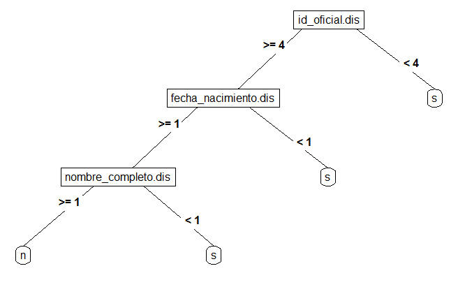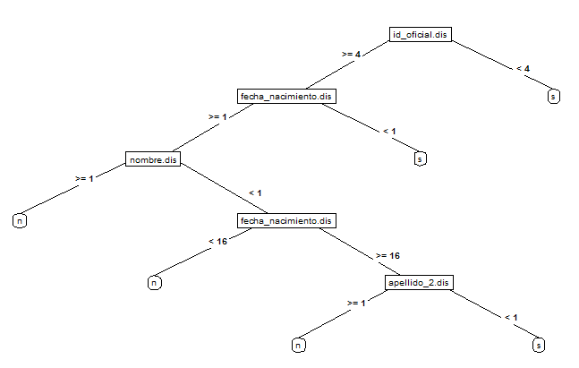 Los árboles de decisión tienen la ventaja de que pueden representarse gráficamente. Este es un árbol de decisión obtenido en la prueba de concepto. Las variables de decisión son las distancias entre cadenas de caracteres, es decir, cuántos caracteres hay que cambiar/quitar/añadir para obtener la misma cadena.