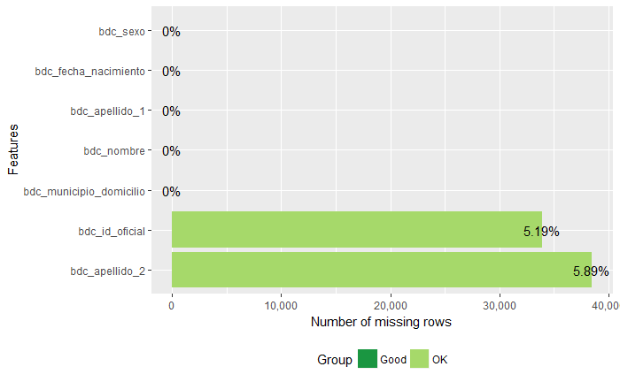 El Registro de Población tiene 653.953 registros. Sólo faltan datos en el identificador oficial y el segundo apellido, pero eso es normal, ya que los menores de 14 años no tienen obligación de tener DNI y muchos extranjeros no usan segundo apellido.