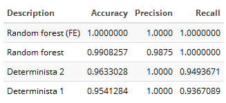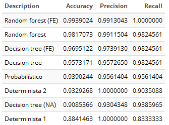 Los modelos de aprendizaje máquina se han entrenado con el conjunto de datos de entrenamiento y se han probado sobre el conjunto de datos de prueba. Los algoritmos deterministas y probabilísticos se han aplicado directamente al conjunto de pruebas.