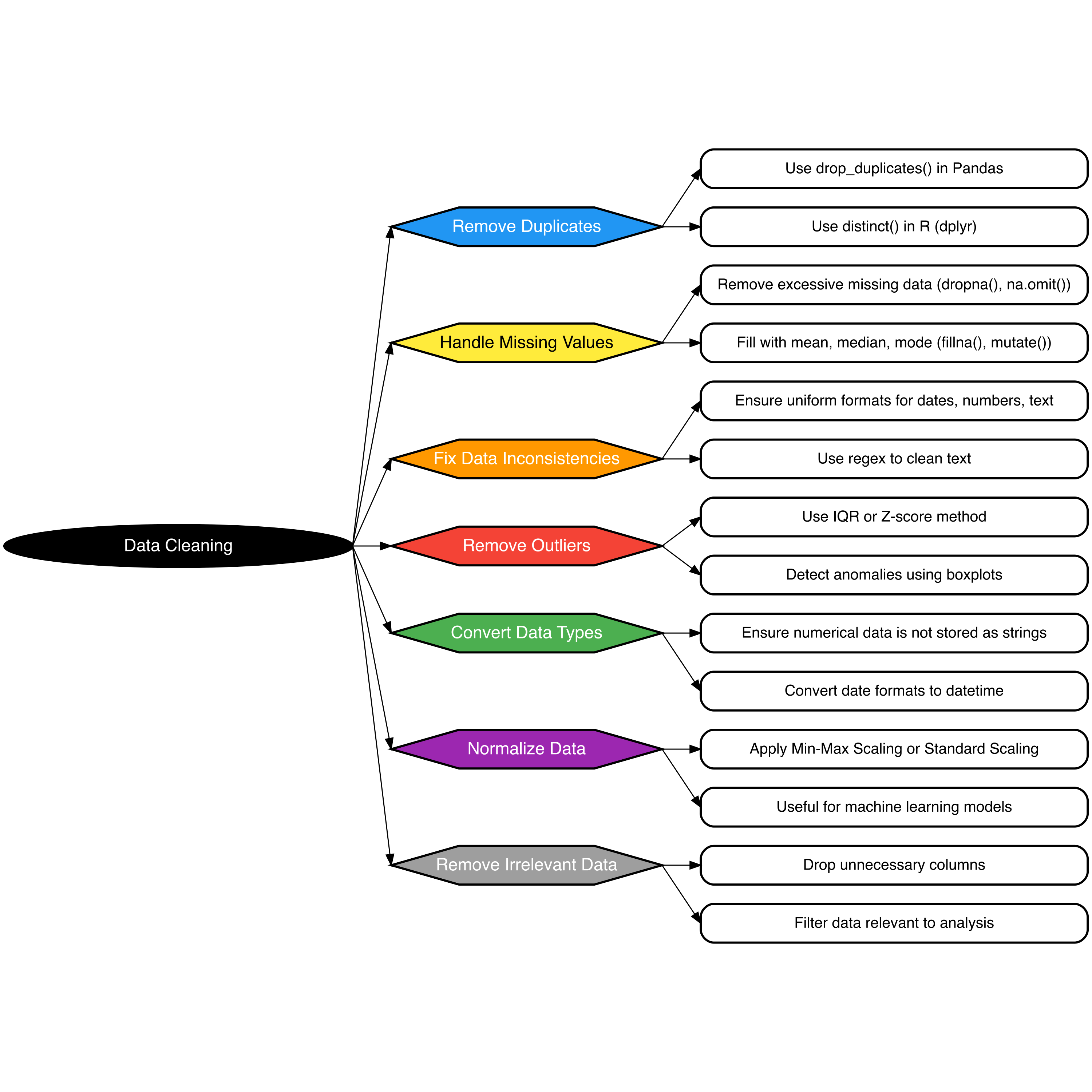 The following Mind Map illustrates the key stages of the Data Cleaning process, including duplicate removal, handling of missing values, normalization, and the treatment of anomalies such as outliers and inconsistencies. By following these steps, data quality can be significantly improved, leading to more accurate and reliable analytical outcomes.