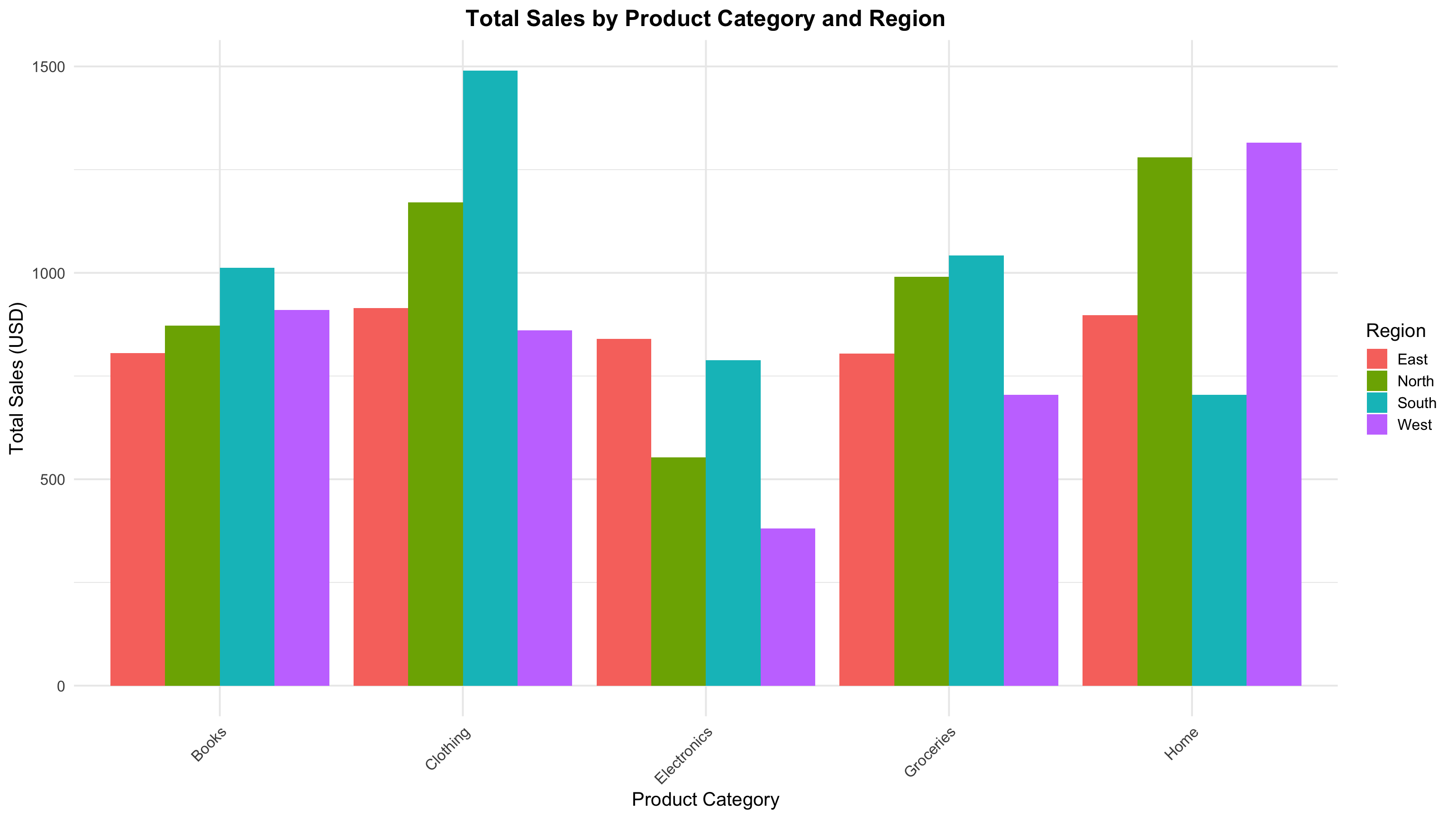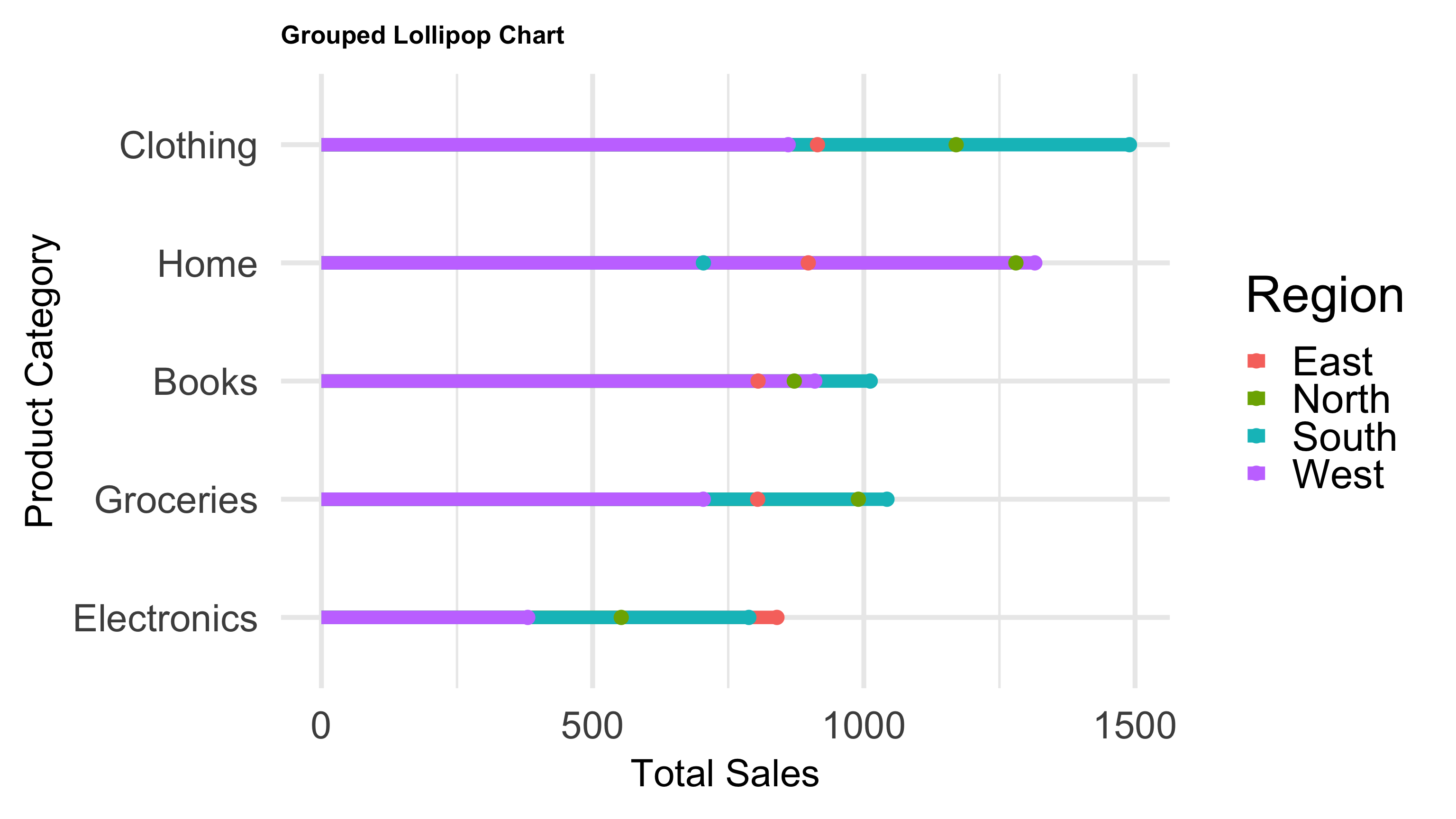 ggplot(sales_grouped, aes(x = Total_Sales, y = reorder(Product_Category, Total_Sales), color = Region)) +