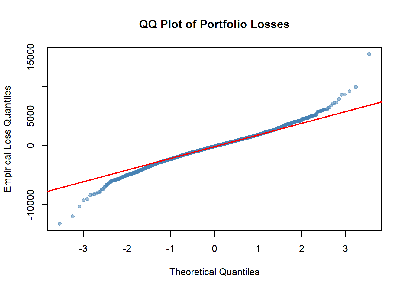 - Upper tail deviation (top-right): Losses are more extreme than normal predicts.