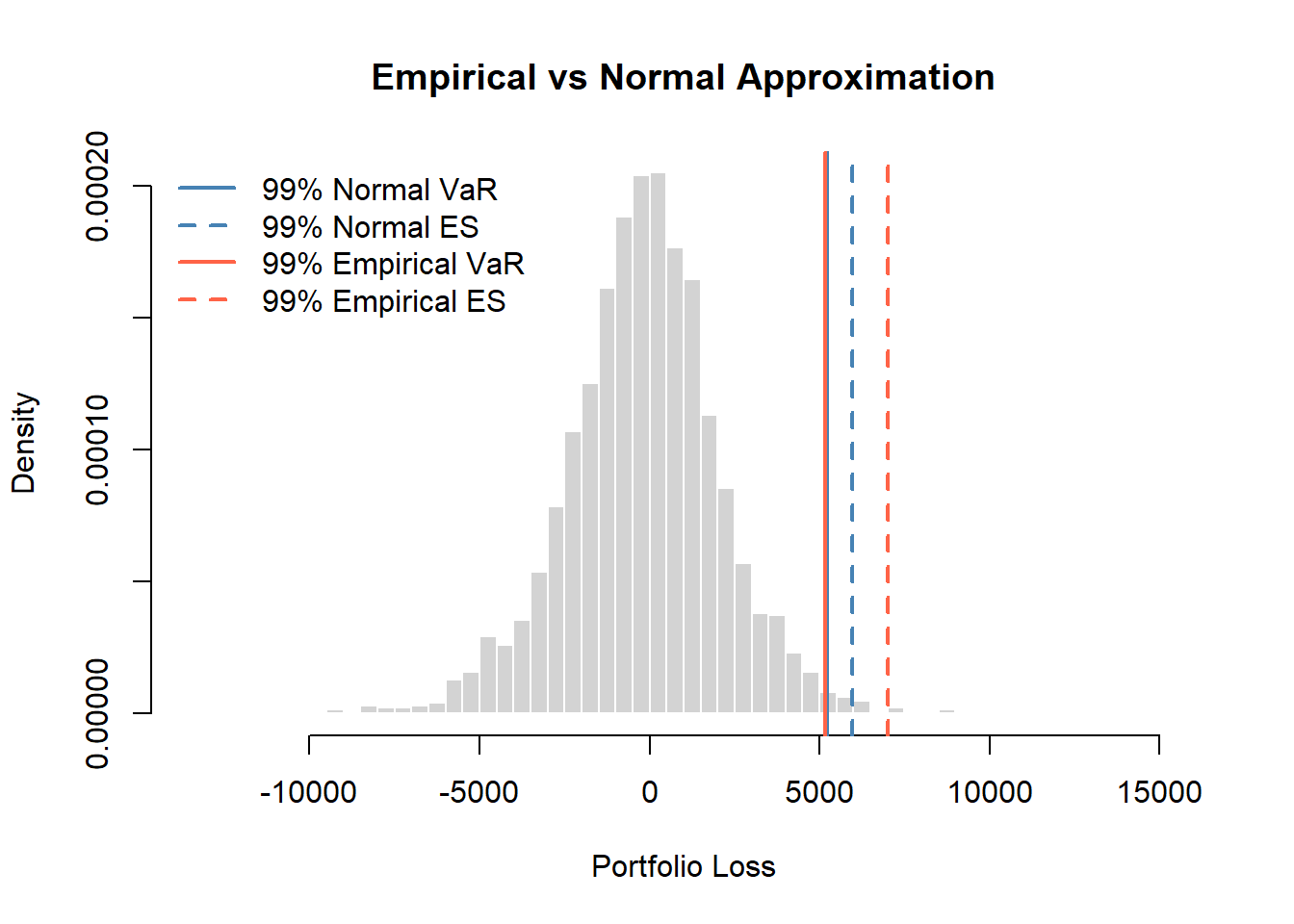 While the \(99\)th percentile itself is normal, the empirical ES is noticeably higher than the normal ES, indicating heavier tails beyond the VaR threshold.