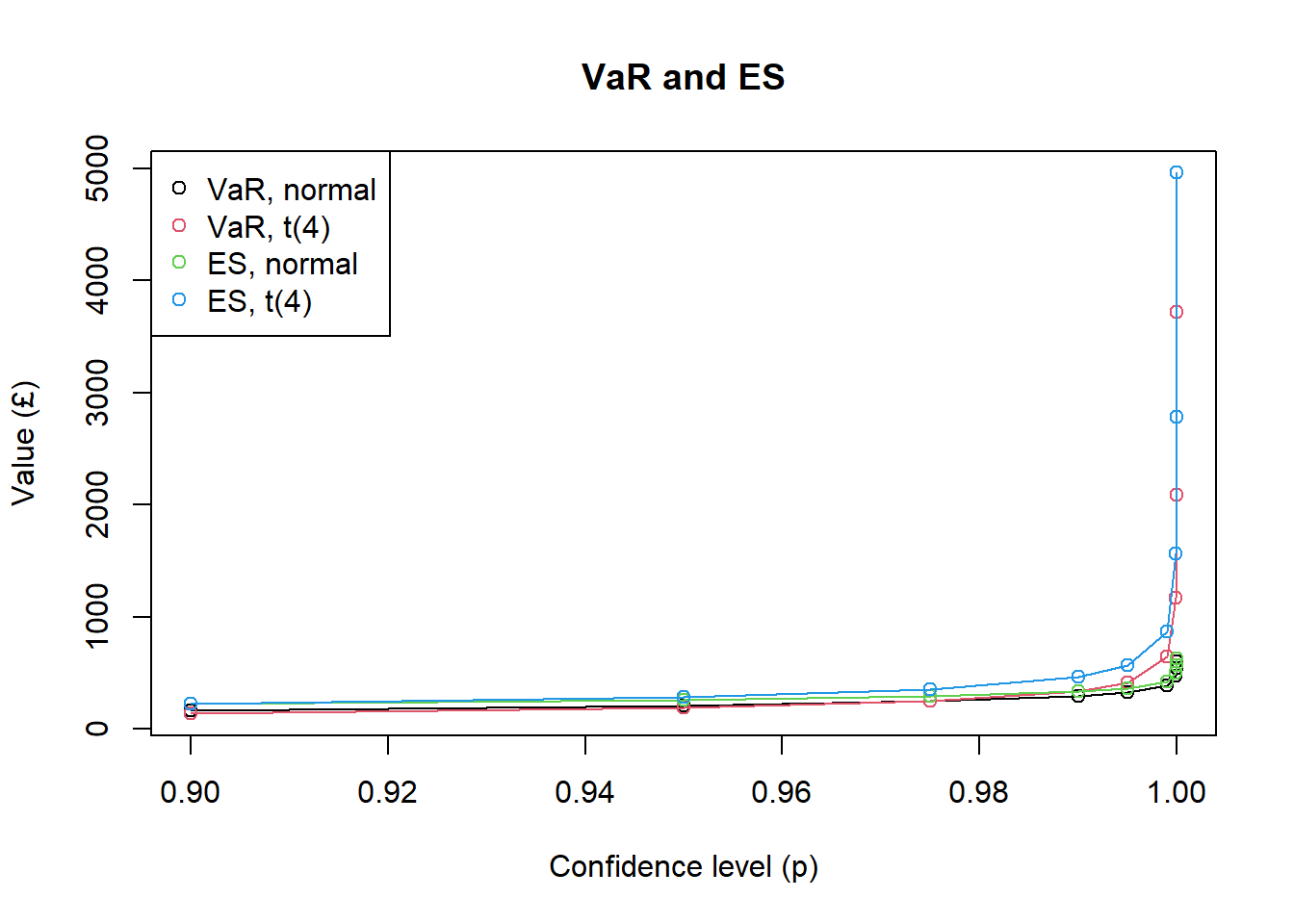 colnames(summary) <- c("p", "VaR.normal", "VaR.t4", "ES.normal", "ES.t4",