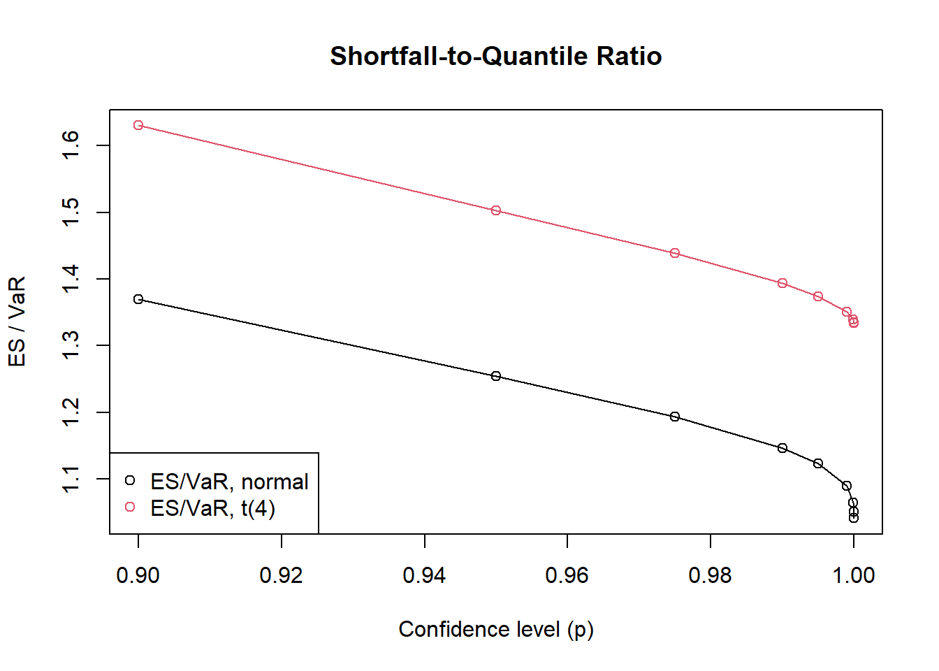 legend = c("ES/VaR, normal", "ES/VaR, t(4)"),