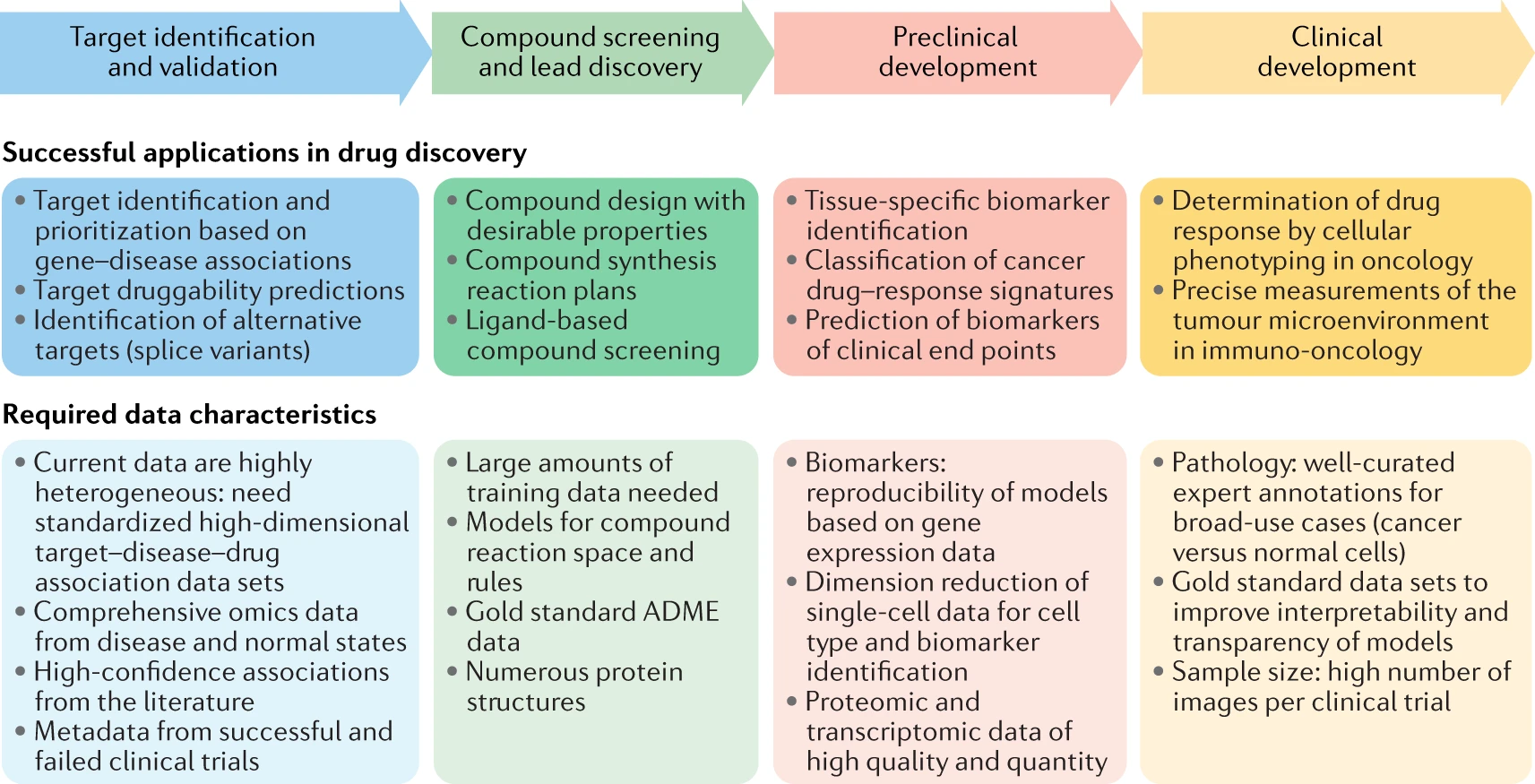 Vamathevan, J., Clark, D., Czodrowski, P., Dunham, I., Ferran, E., Lee, G., Li, B., Madabhushi, A., Shah, P., Spitzer, M., & Zhao, S. (2019). Applications of machine learning in drug discovery and development. Nature Reviews Drug Discovery, 18(6), 463-477. https://doi.org/10.1038/s41573-019-0024-5