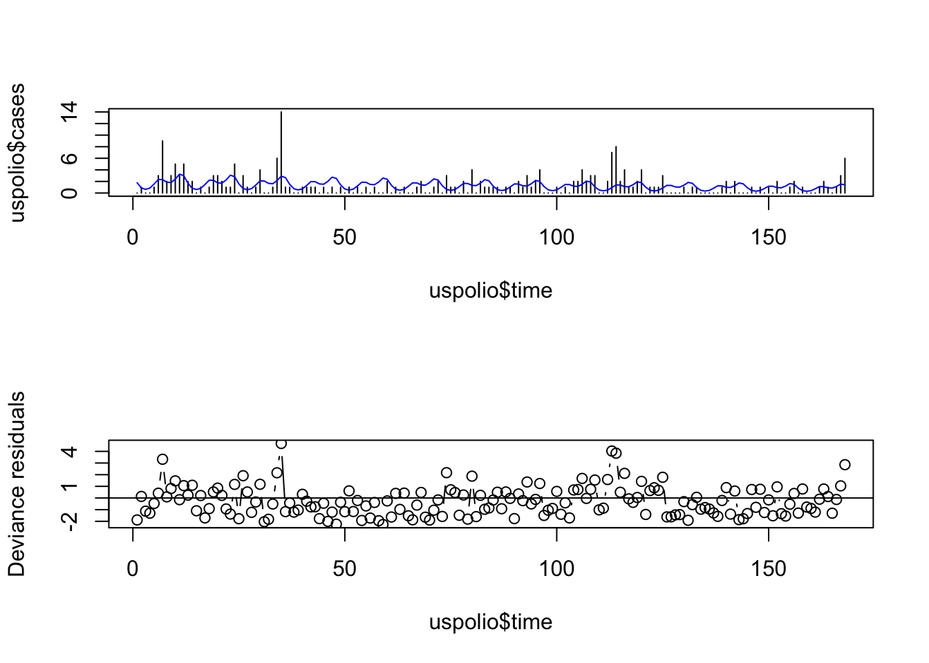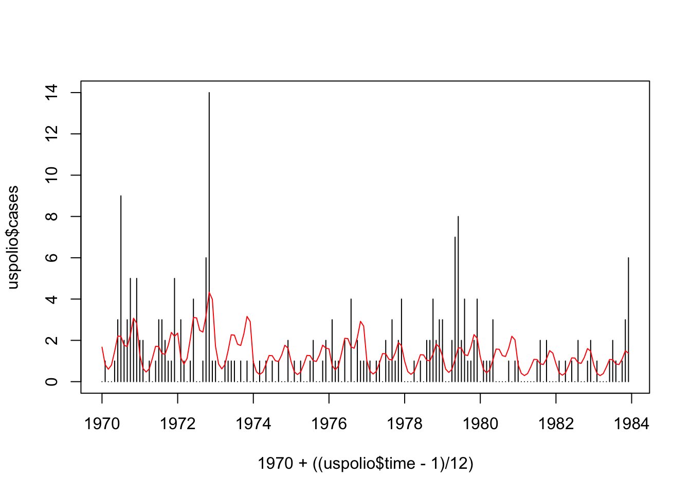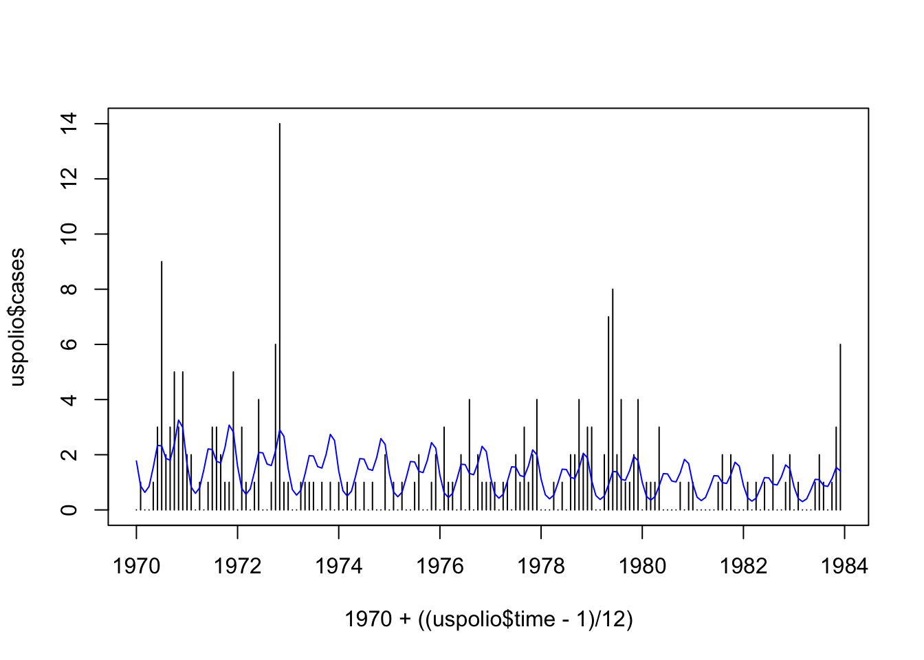 polio2.glm <- glm(cases~time + I(cos(2*pi*time/12)) + I(sin(2*pi*time/12))
