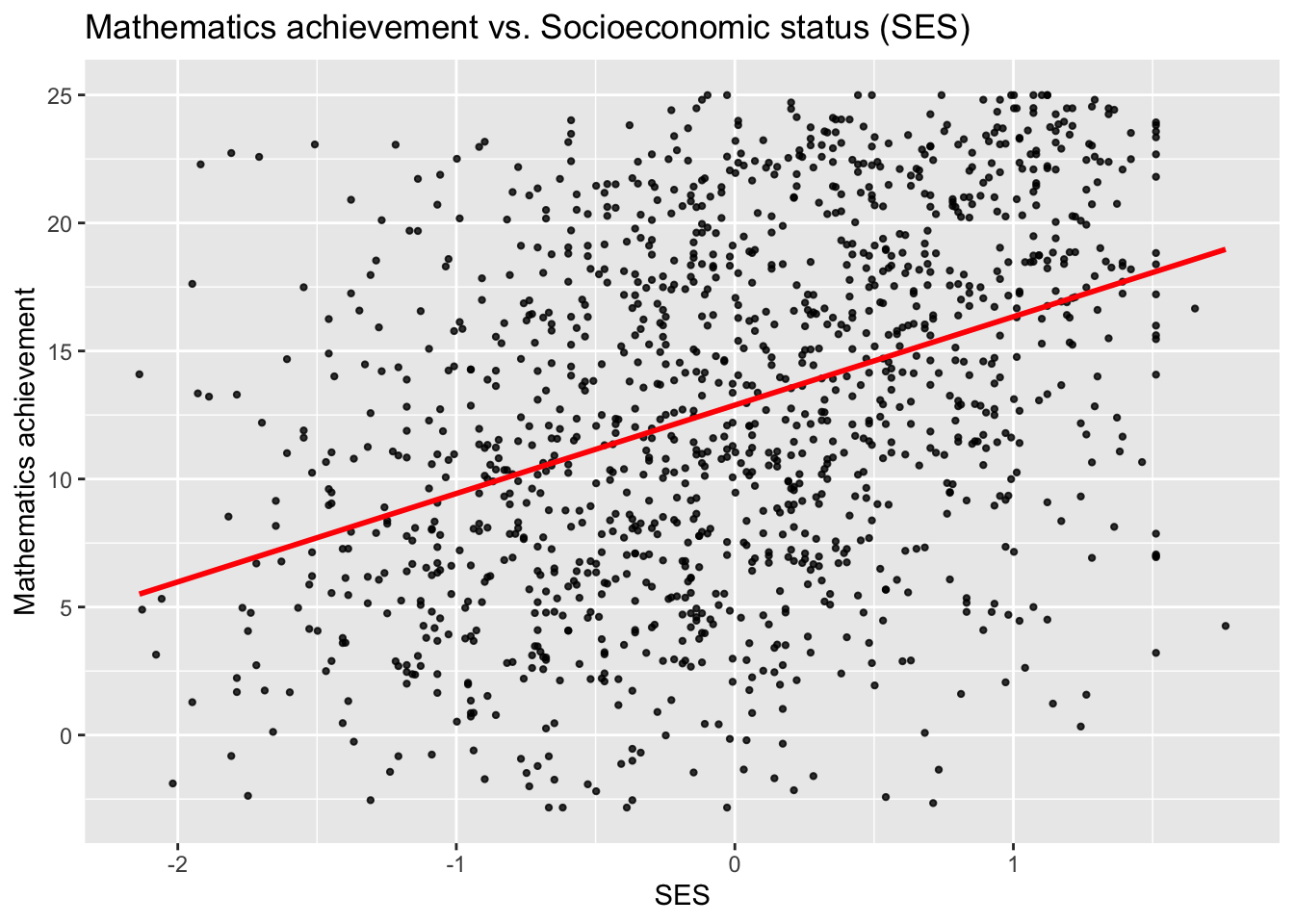 ggtitle("Mathematics achievement vs. Socioeconomic status (SES)",