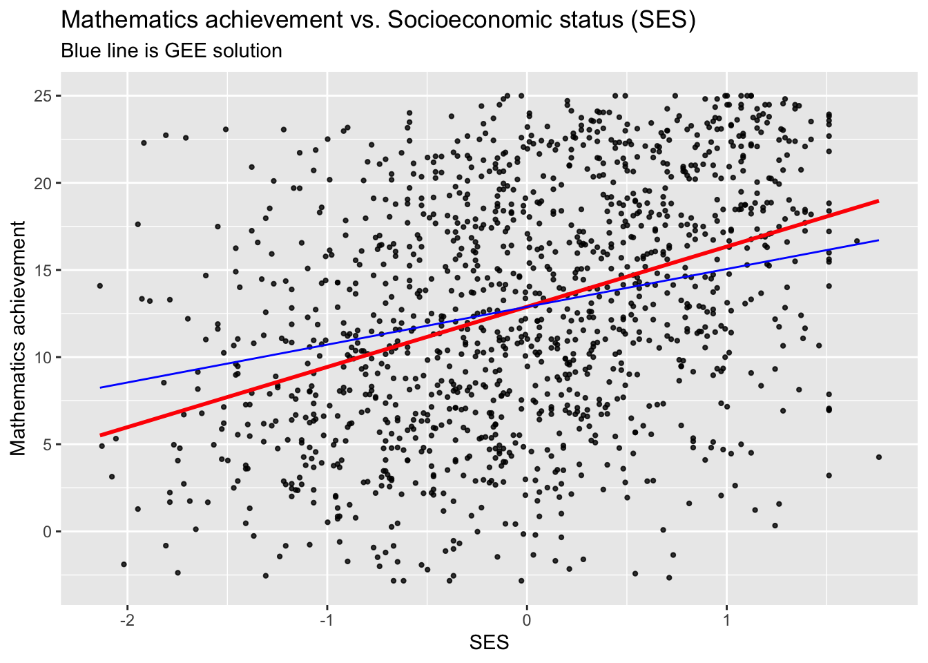 ggtitle("Mathematics achievement vs. Socioeconomic status (SES)") +