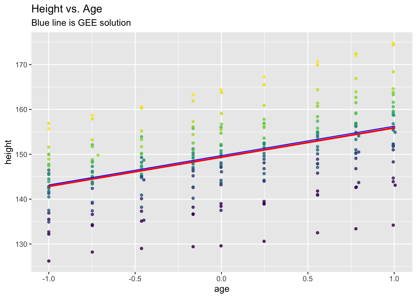 labs(title = "Height vs. Age", subtitle="Blue line is GEE solution") +