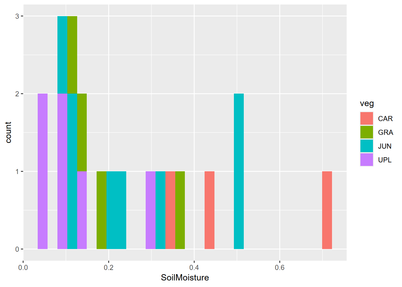 . What we can see is that this is a small sample. This study involved a lot of drone imagery, probably 100s of GB of imagery, which was the main focus of the study – to detect channels – but a low density of soil and vegetation ground samples. - Create a histogram of soil moisture colored by veg, also for the July data. We see the same story, with not very many samples, though suggestive of a multimodal distribution overall.