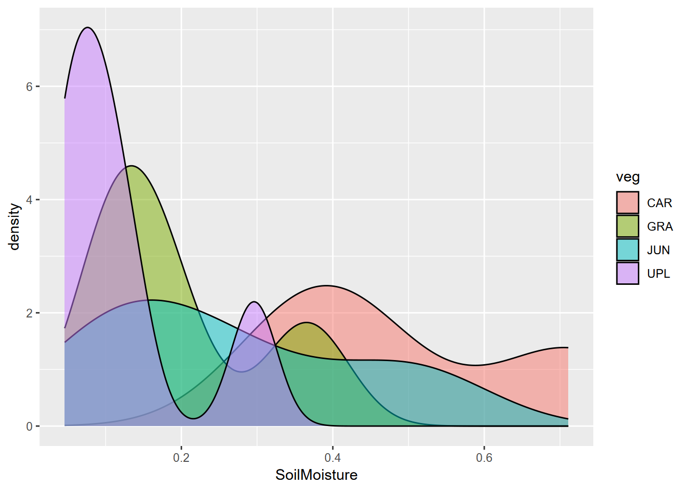 We’ll now look at bulk density for all samples (soilveg), including both July and August. Soil moisture and NDVI won’t be a part of this analysis, only bulk density and vegetation. Look at the distribution of all bulk density values, using both a histogram with 20 bins and a density plot, then run an ANOVA test of bulk density predicted by (~) veg. What does the Pr(>F) value indicate?