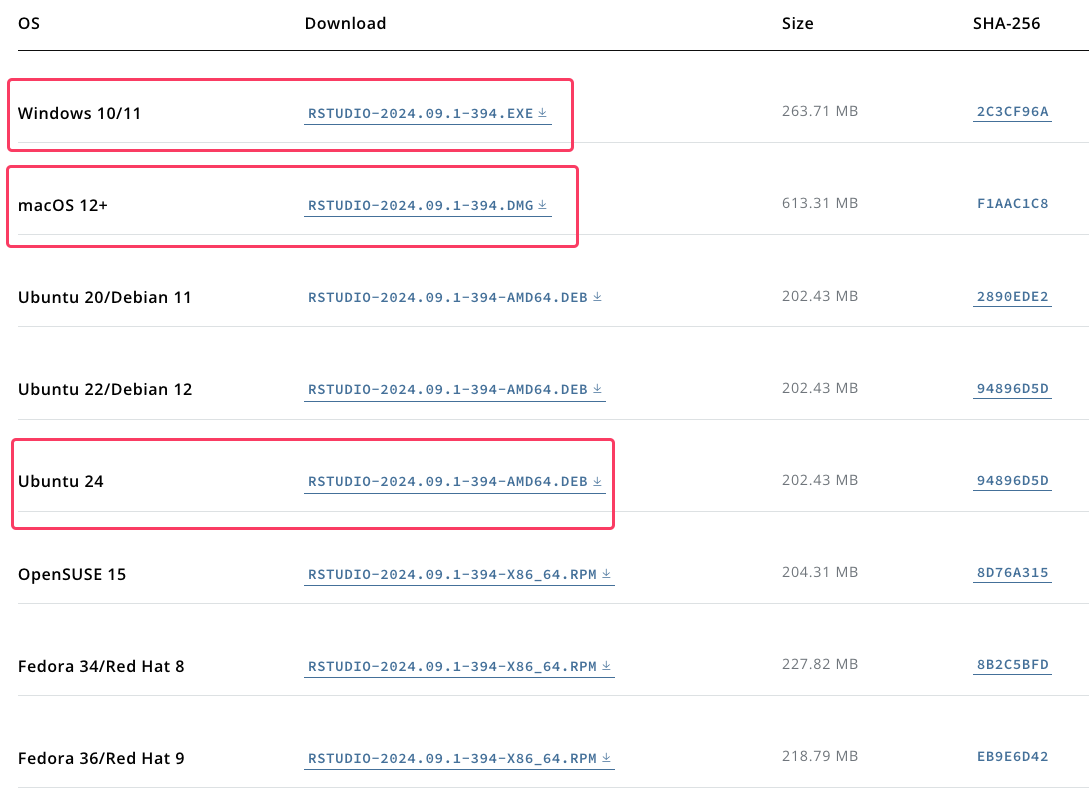 2.1.0.2 Väl på denna sidan, välj R för det operativsystem som du har på din dator, antingen Windows eller macOS, genom att klicka på någon av länkarna.