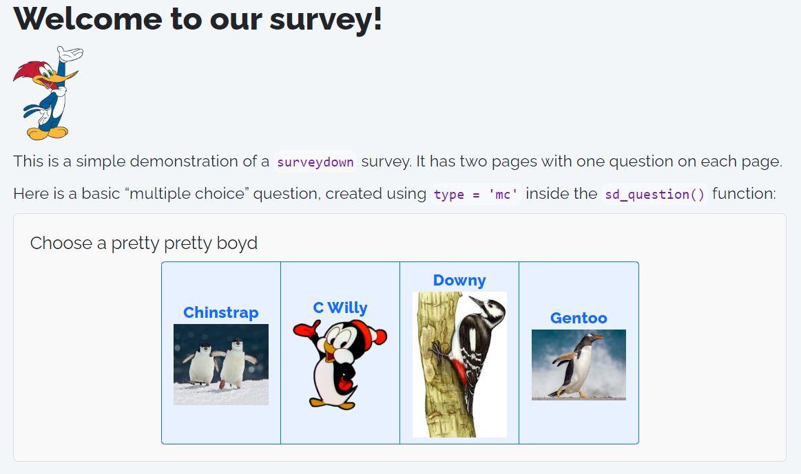 sd_question(type ="mc",id ="penguins",label ="Which is your favorite type of penguin?",option =c('Chinstrap'='chinstrap','Chilly Willy'="chilly",'Downy WP'='woody',"Gentoo"='gentoo' ))sd_question(type ='mc_buttons',id ='penguins2',label ="Choose a SECOND penguin that is different from the previous",option =c(# 'Chinstrap' = 'chinstrap','Chilly Willy'="chilly",'Downy WP'='woody',"Gentoo"='gentoo' ))sd_question(type ='mc_buttons',id ='penguins3',label ="Choose a SECOND penguin that is different from the previous",option =c('Chinstrap'='chinstrap',# 'Chilly Willy' = "chilly",'Downy WP'='woody',"Gentoo"='gentoo' ))sd_question(type ='mc_buttons',id ='penguins4',label ="Choose a SECOND penguin that is different from the previous",option =c('Chinstrap'='chinstrap','Chilly Willy'="chilly",# 'Downy WP' = 'woody',"Gentoo"='gentoo' ))sd_question(type ='mc_buttons',id ='penguins5',label ="Choose a SECOND penguin that is different from the previous",option =c('Chinstrap'='chinstrap','Chilly Willy'="chilly",'Downy WP'='woody'# "Gentoo" = 'gentoo' ))