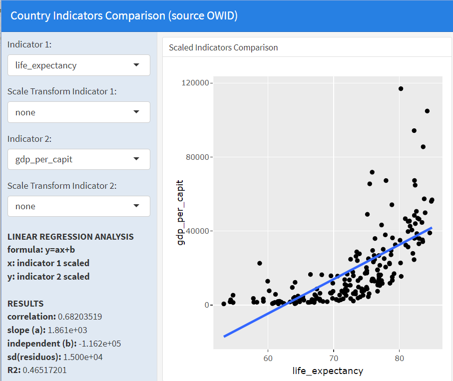 Al estudiar en este cuadro de mandos la relación entre los atributos life_expectancy y gdp_per_capit observamos en la siguiente imagen que no existe una buena relación lineal entre ellos: