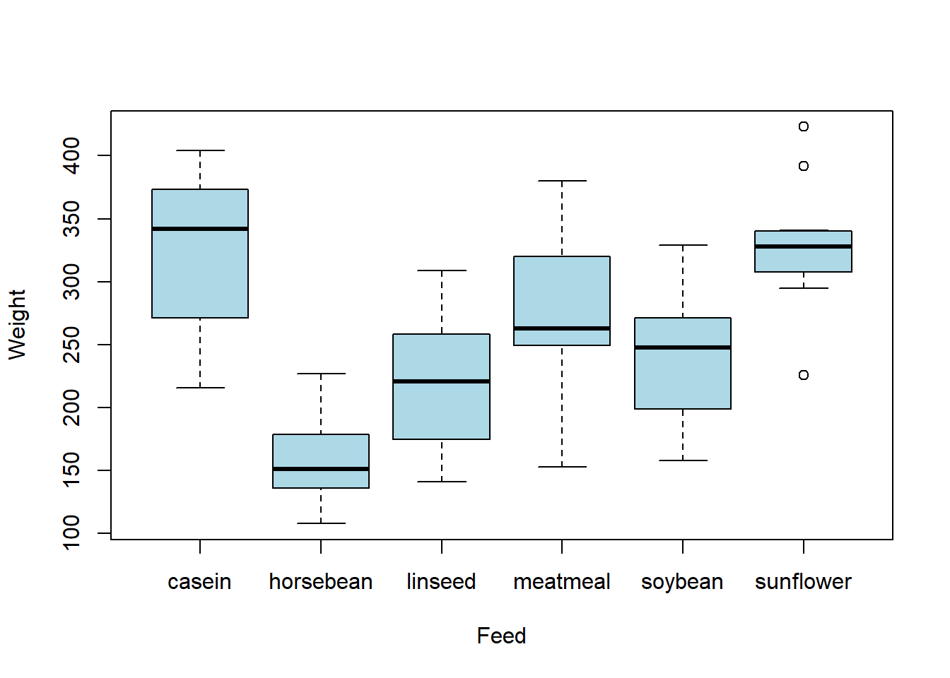 - Use the boxplots below to answer questions a-b. Note that these are called side-by-side boxplots and can be used to compare different categories. In this case, we are comparing weights of chickens who have been given various types of feed.