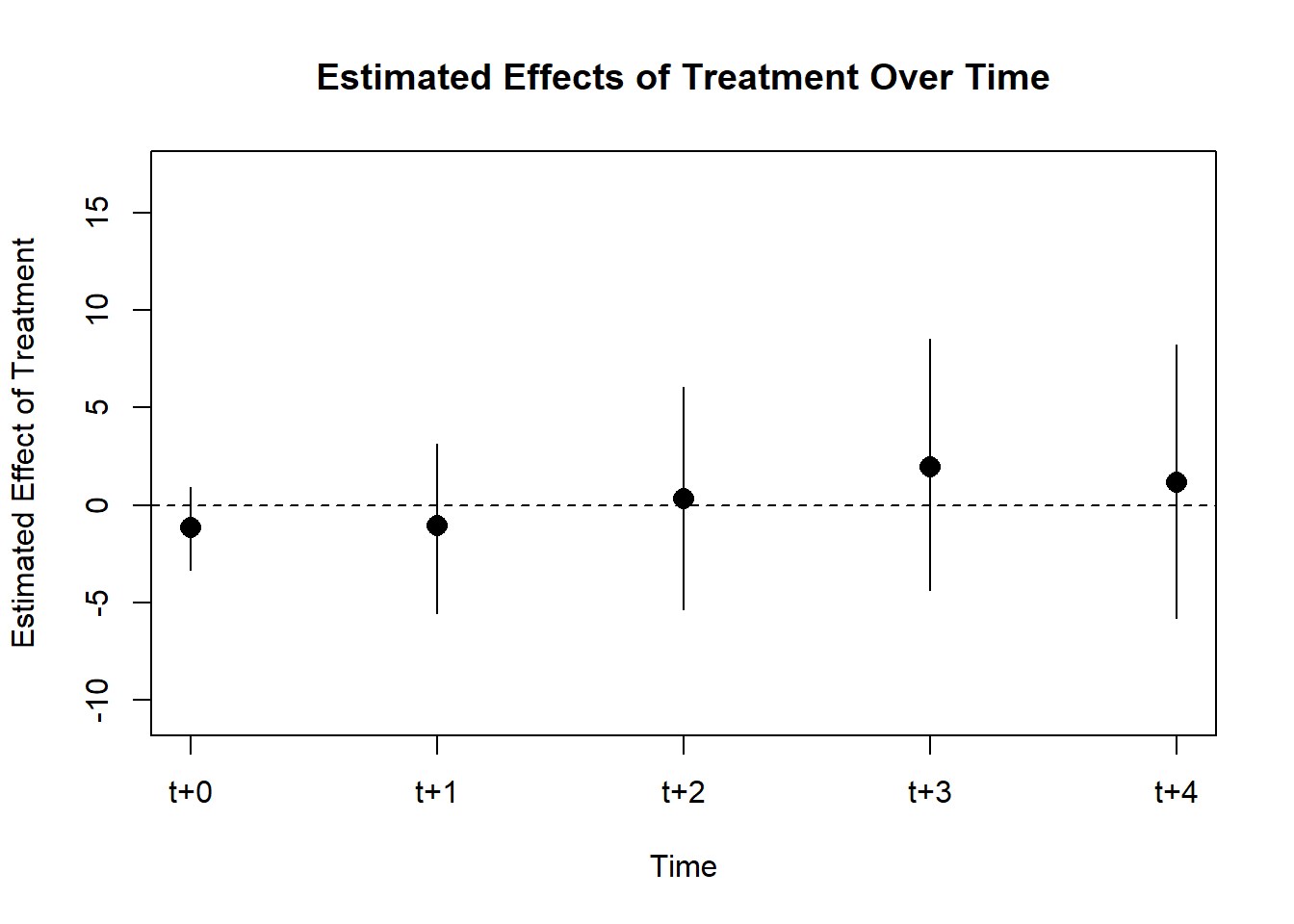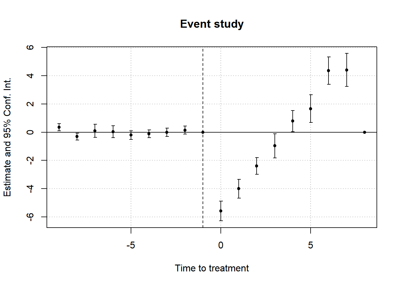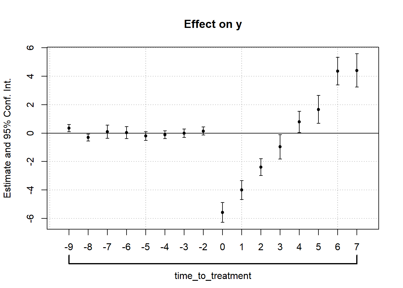 Inspect the estimates and confidence intervals. Ideally, pre-treatment estimates should be near 0, and post-treatment estimates near \(-0.05\).