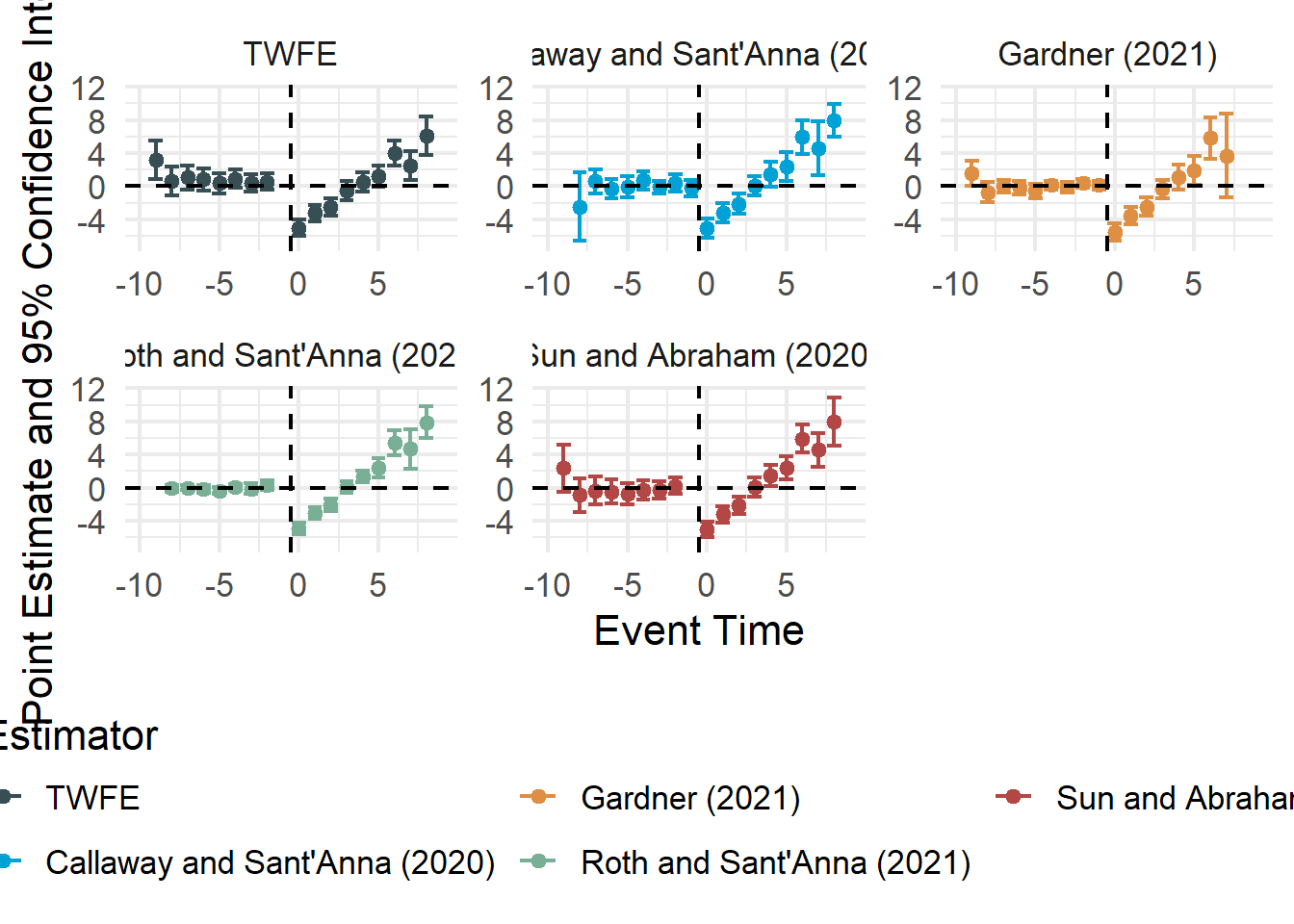 staggered_cs()implements the Callaway and Sant’Anna (2021) estimator.staggered_sa()implements the L. Sun and Abraham (2021) estimator, which adjusts for bias from comparisons involving already-treated units.