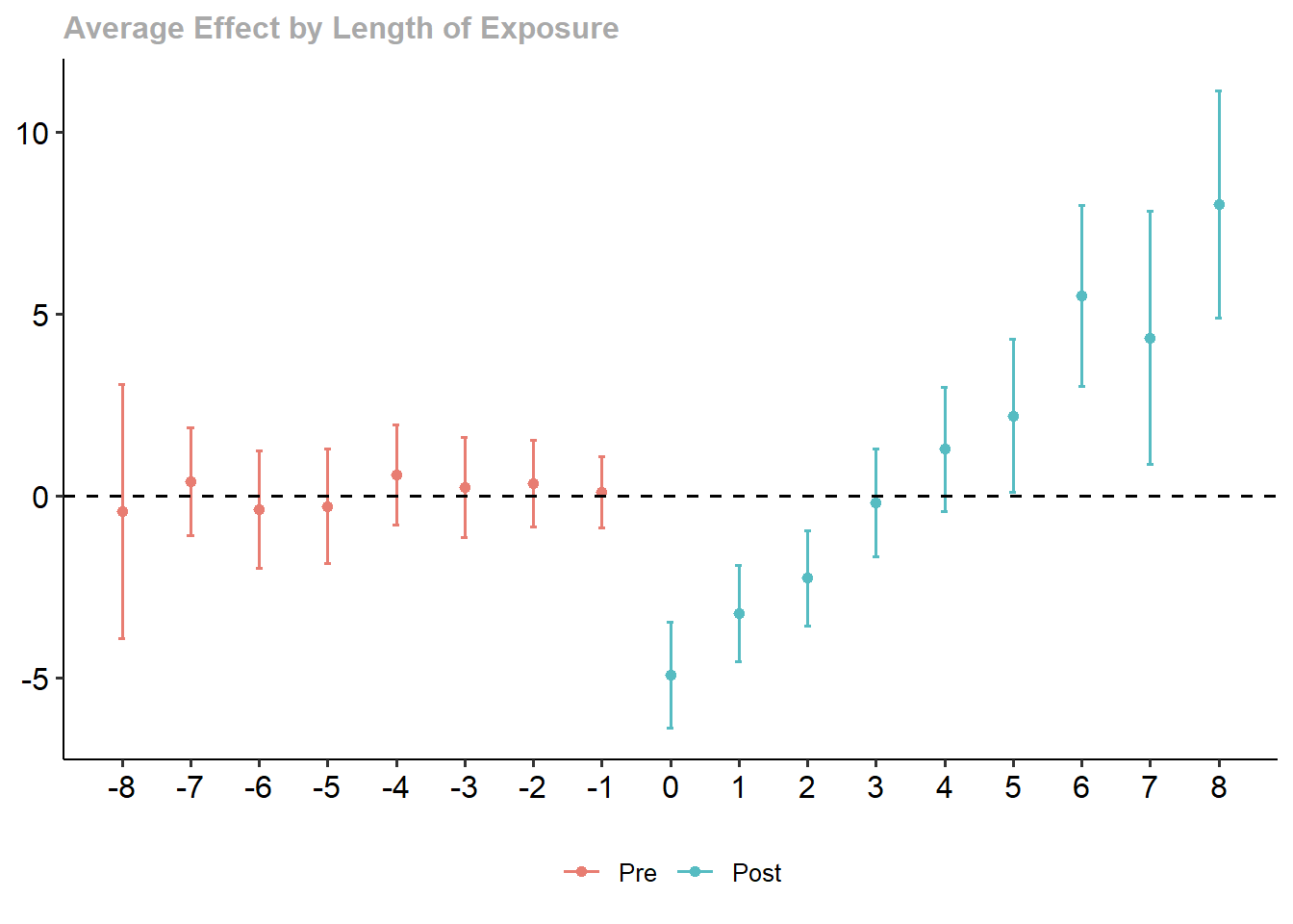 #> 1 -0.5861831 0.1768297 0.1770729To visualize treatment dynamics around the time of adoption, the event study specification estimates dynamic treatment effects relative to the time of treatment (Figure 30.9).