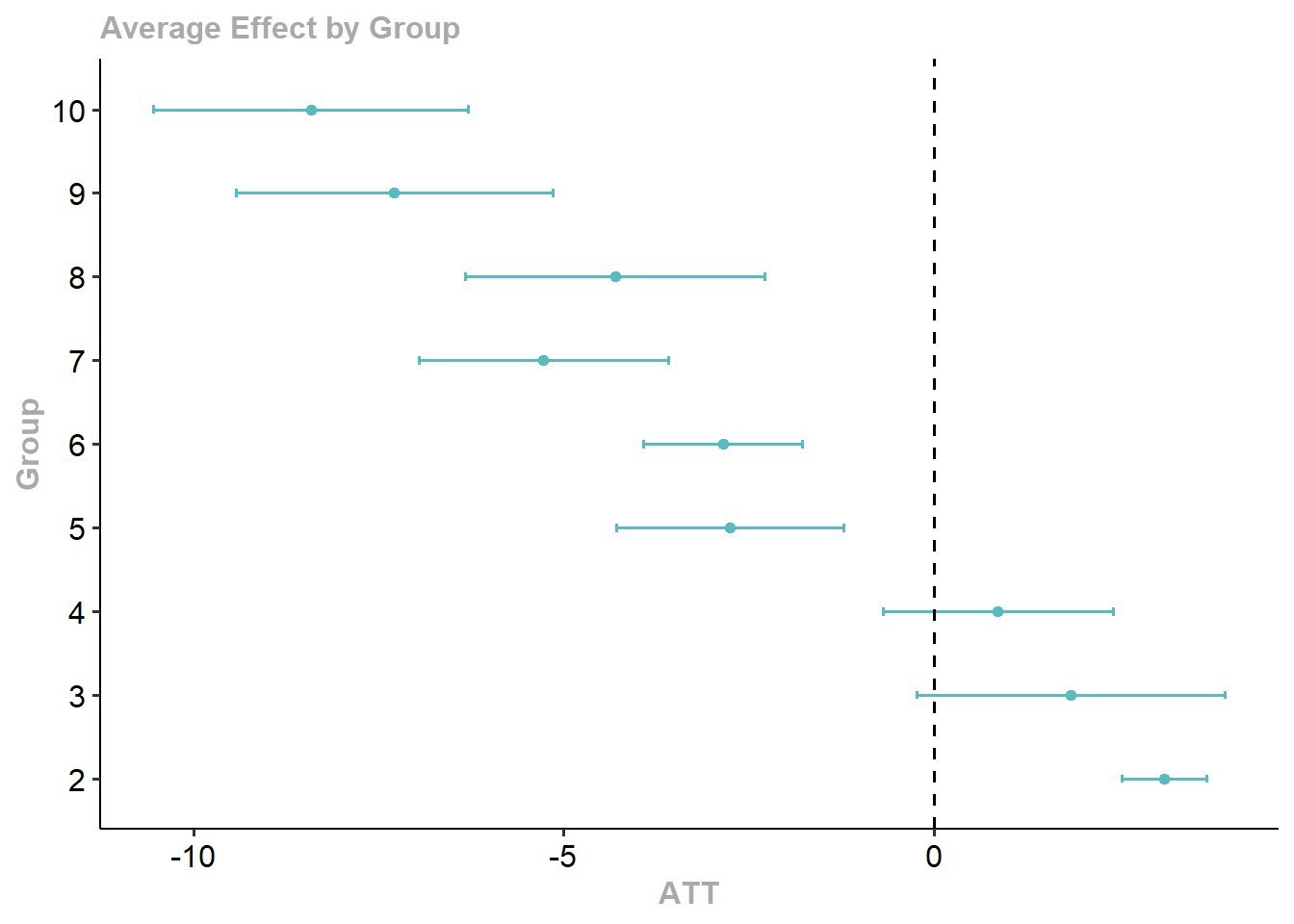 Average effect over all periods after treatment for group \(g\): \[ \theta_S(g) = \frac{1}{\tau - g + 1} \sum_{t = g}^{\tau} ATT(g, t) \]- \(\tau\): Last time period in the panel.