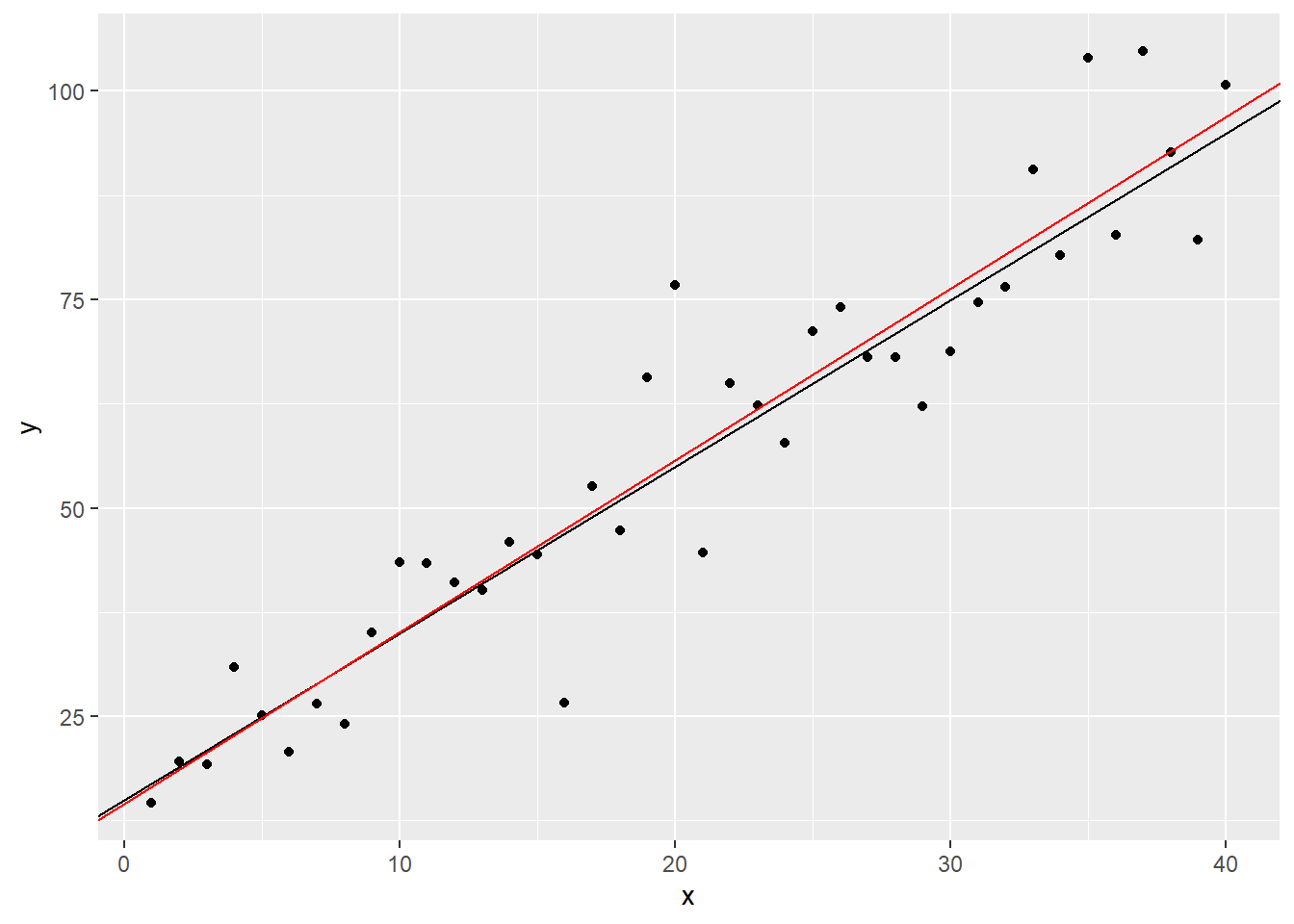 ggplot() + # points (y_i, x_i) geom_point(aes(x=x,y=y)) + # line of y = 15+2x geom_abline(intercept=15,slope=2) + # fitted line geom_abline(intercept=coef(mod)[1], slope=coef(mod)[2], color = "red")