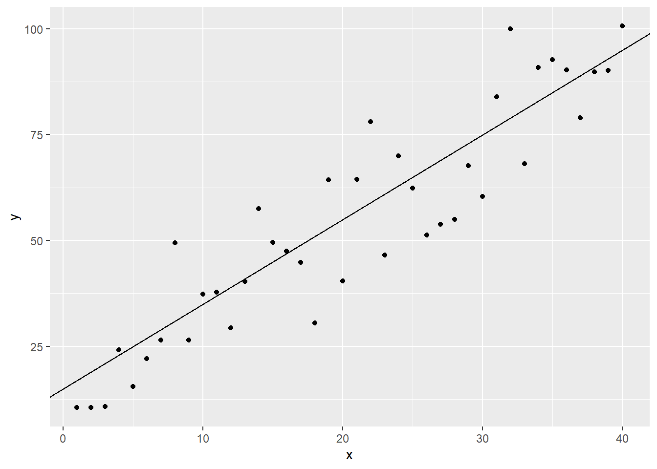 ggplot()+ geom_point(aes(x=x,y=y)) + # points (y_i, x_i) geom_abline(intercept=15,slope=2) # line of y = 15+2x