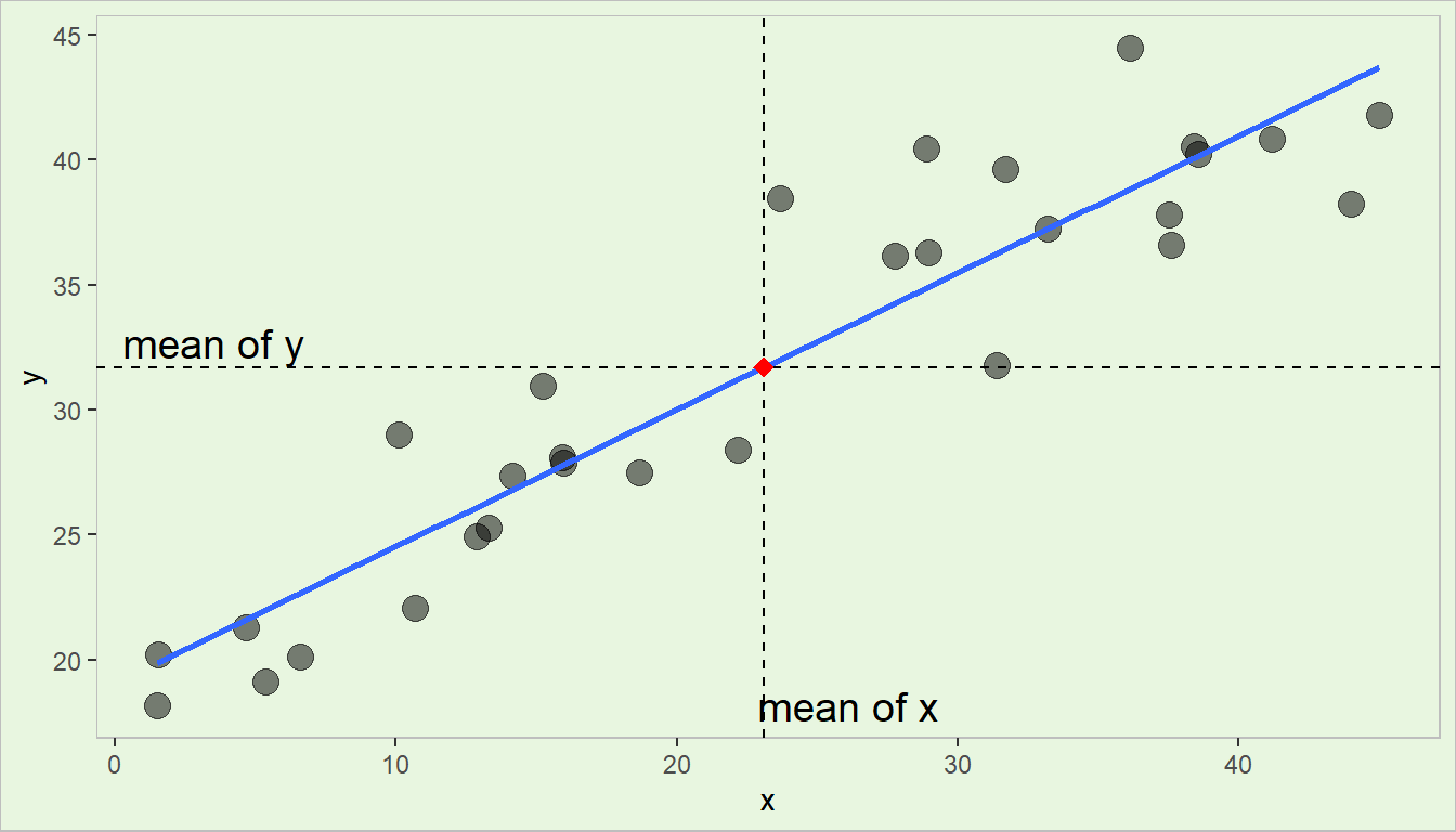 Theorem 4.6 The least squares regression line always passes through the centroid (the point comprising of the means of the dependent and independent variables). That is, if \((\bar{y},\bar{x_1},\bar{x_2},\cdots,\bar{x_k})\) is the centroid of the the dataset, the following equation is true: \[ \bar{y}=\hat{\beta}_0 + \hat{\beta}_1 \bar{x}_1 + \hat{\beta}_2 \bar{x}_2 +\cdots + \hat{\beta}_k \bar{x}_k \]
