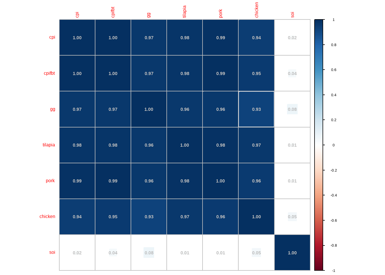 From the correlation plot, the Consumer Price Index and the prices of different goods are highly (almost perfect) correlated. Afterall, the CPI is a function of prices of different goods.