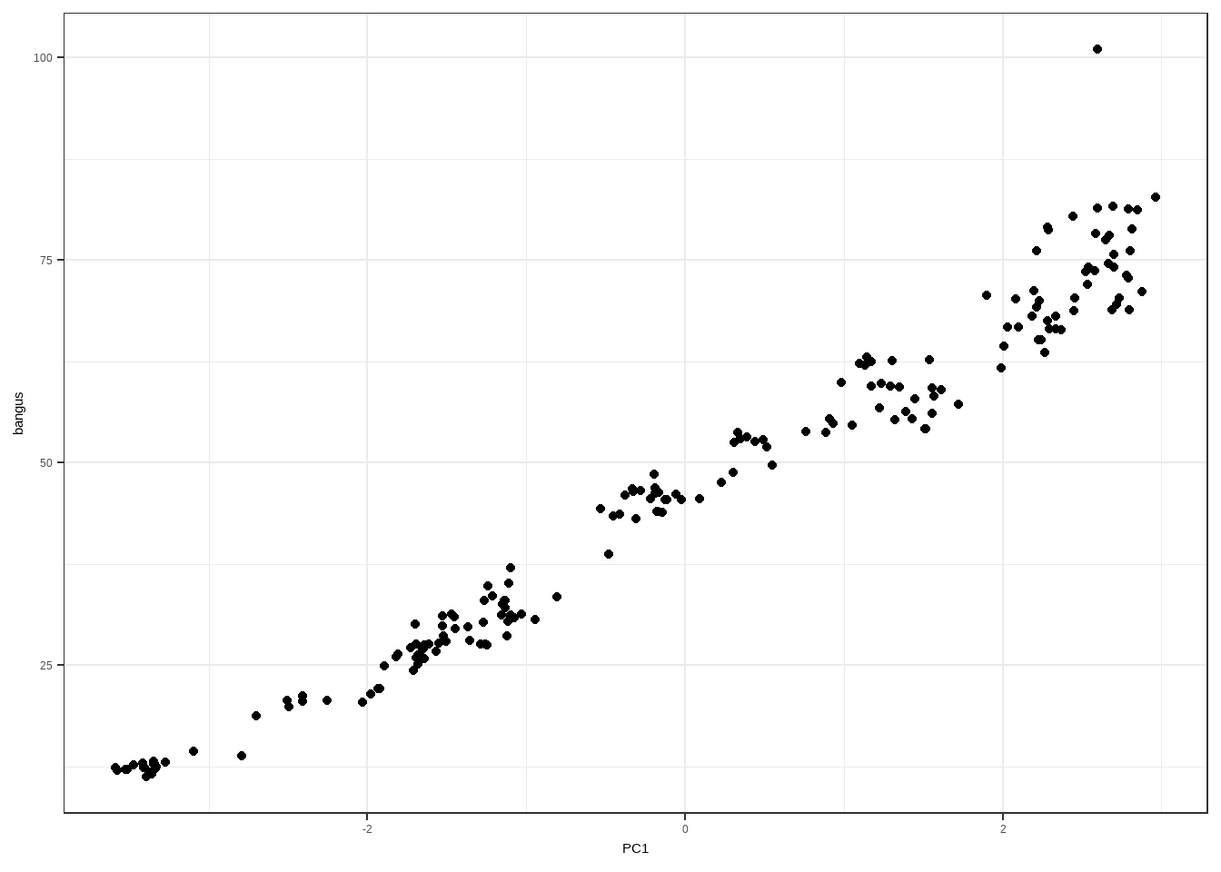 model_bangus <- lm(bangus ~ gg + tilapia + pork + chicken + soi, data = bangus) car::vif(model_bangus)## gg tilapia pork chicken soi ## 17.378676 41.040410 30.910613 17.715844 1.131336Even with the deletion of of CPI, multicollinearity still exists. We now perform a principal component regression.
