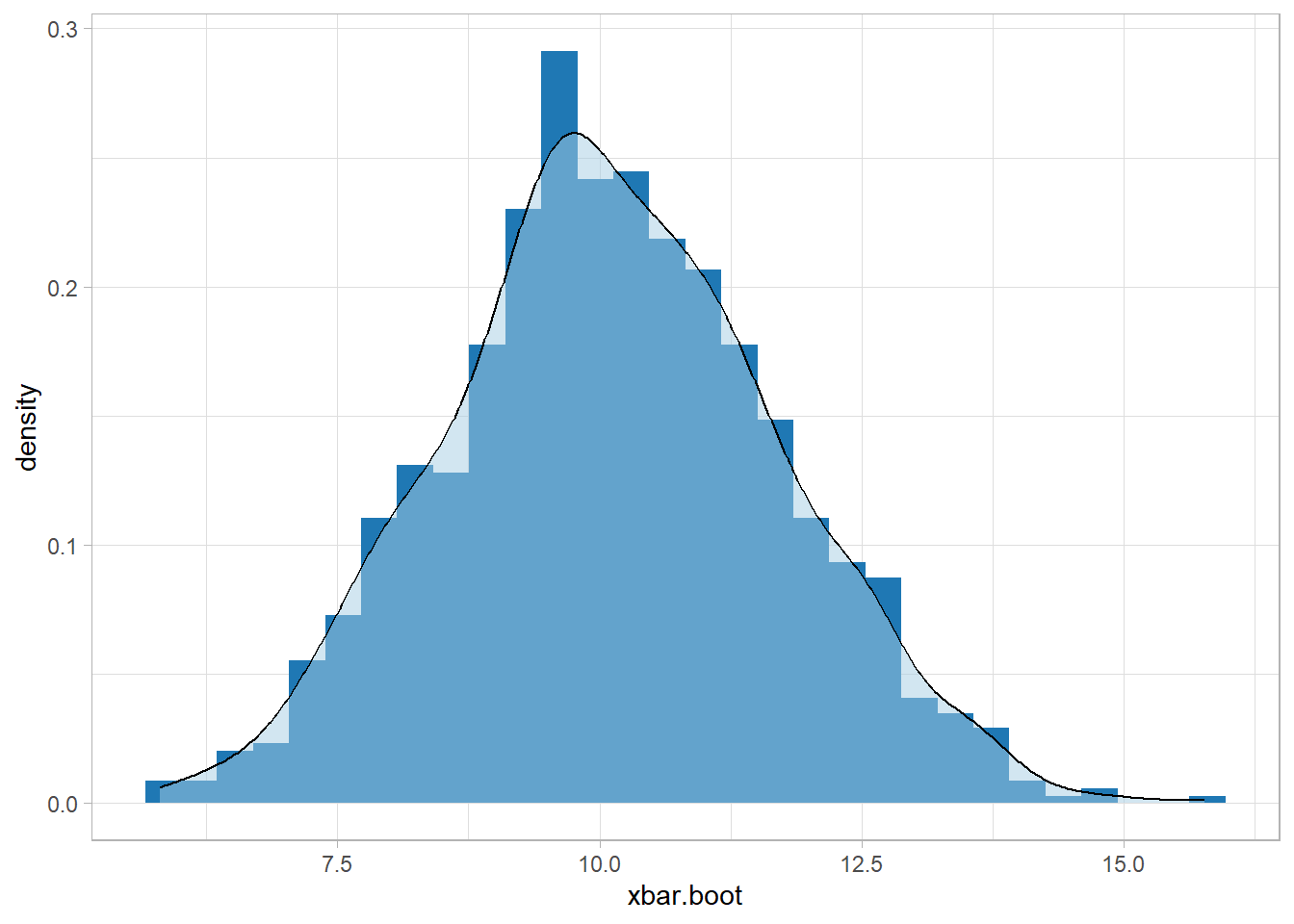 Now that we have the estimated parameters of the negative binomial distribution, we can now have bootstrap estimate of the sampling distribution of the sample mean \(\bar{X}\).