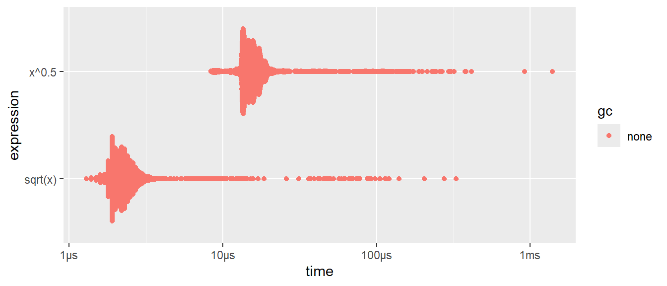 sqrt()function is faster than the general exponentiation operator.You can visualize the distribution of the individual timings with