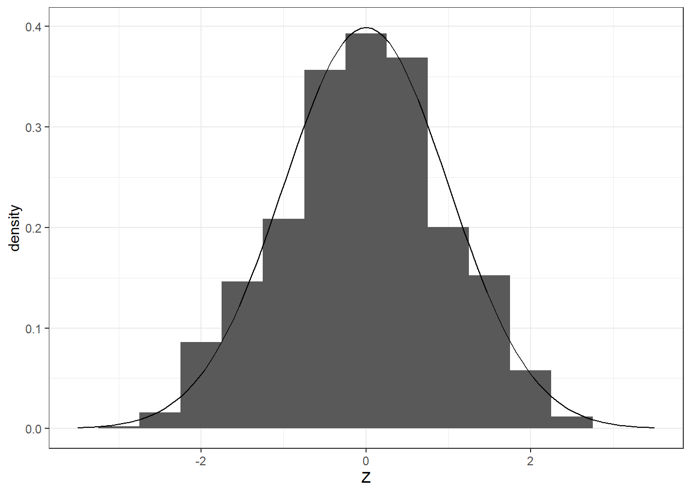 \[ \frac{\bar{X}_n-\mu}{\sigma/\sqrt{n}} \] By the Central limit theorem, we know that this approaches the standard normal distribution, for a random sample \(X_1,X_2,...,X_n\) from a population with mean \(\mu\) and finite variance \(\sigma^2\).