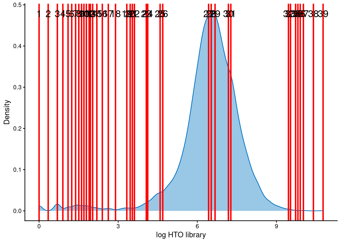 The distribution of HTO library sizes for these outlier cells is not typically multimodal, so a large value of num_modes was tested to identify an appropriate cut-off between negatives and doublets. Lines 25 and 26 are considered possible cut-offs because their values are close to 5, which corresponds to an HTO library size (total hashtag counts per cell) of \(e^5\approx148\), a reasonable threshold. We ultimately choose line 26 as the cut-off.
