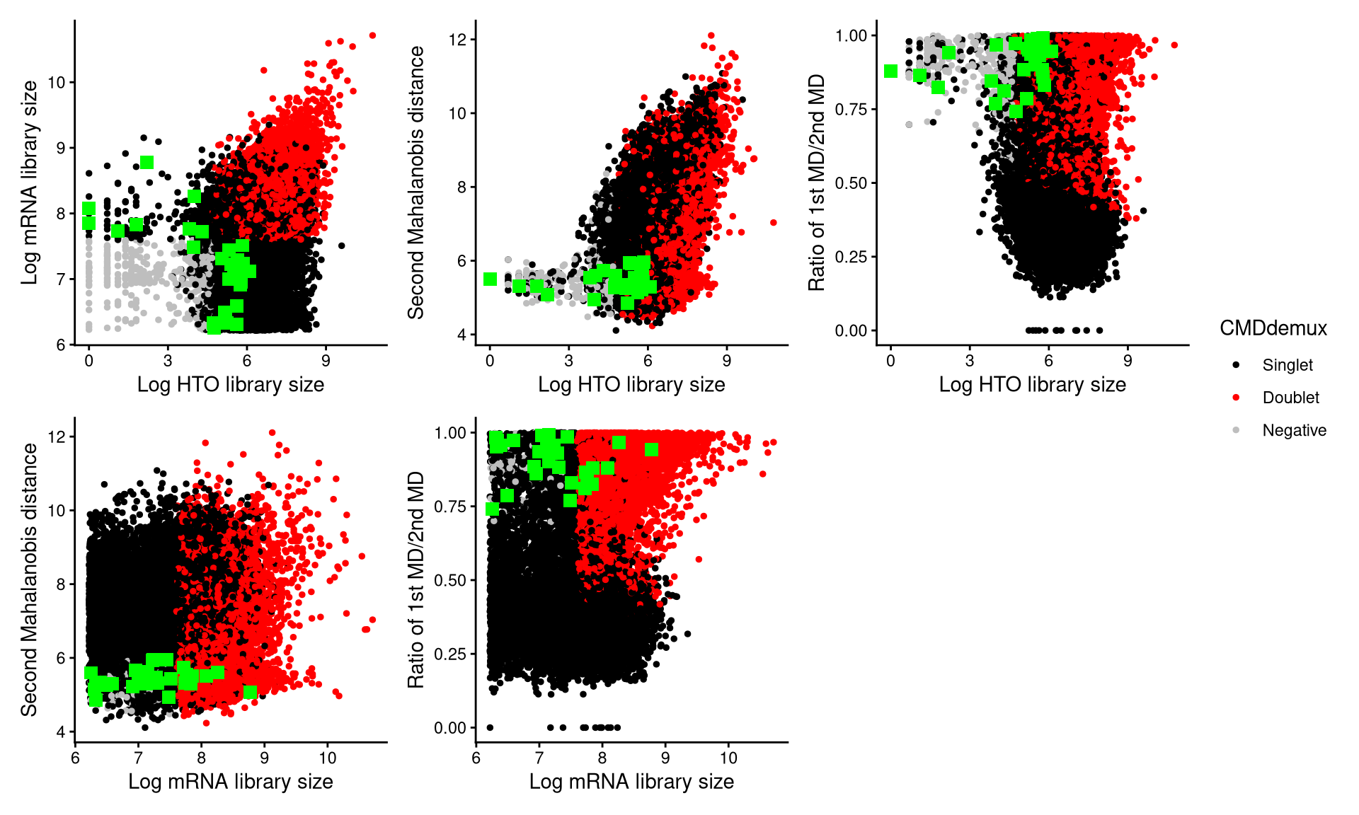 CheckAssign2DPlot consists of pairwise 2D plots of HTO library sizes, mRNA library sizes, the second Mahalanobis distance, and the ratio of the first to the second Mahalanobis distance. Negatives, singlets, and doublets are separated into different regions in these 2D plots.