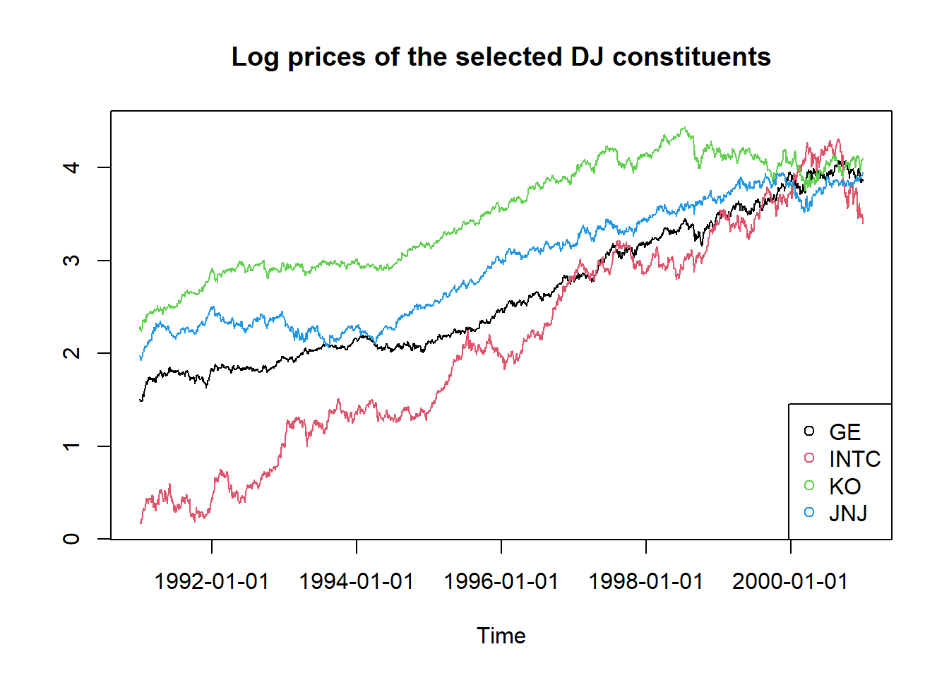 R.Construct and plot the time series of the log prices of your selected stocks.