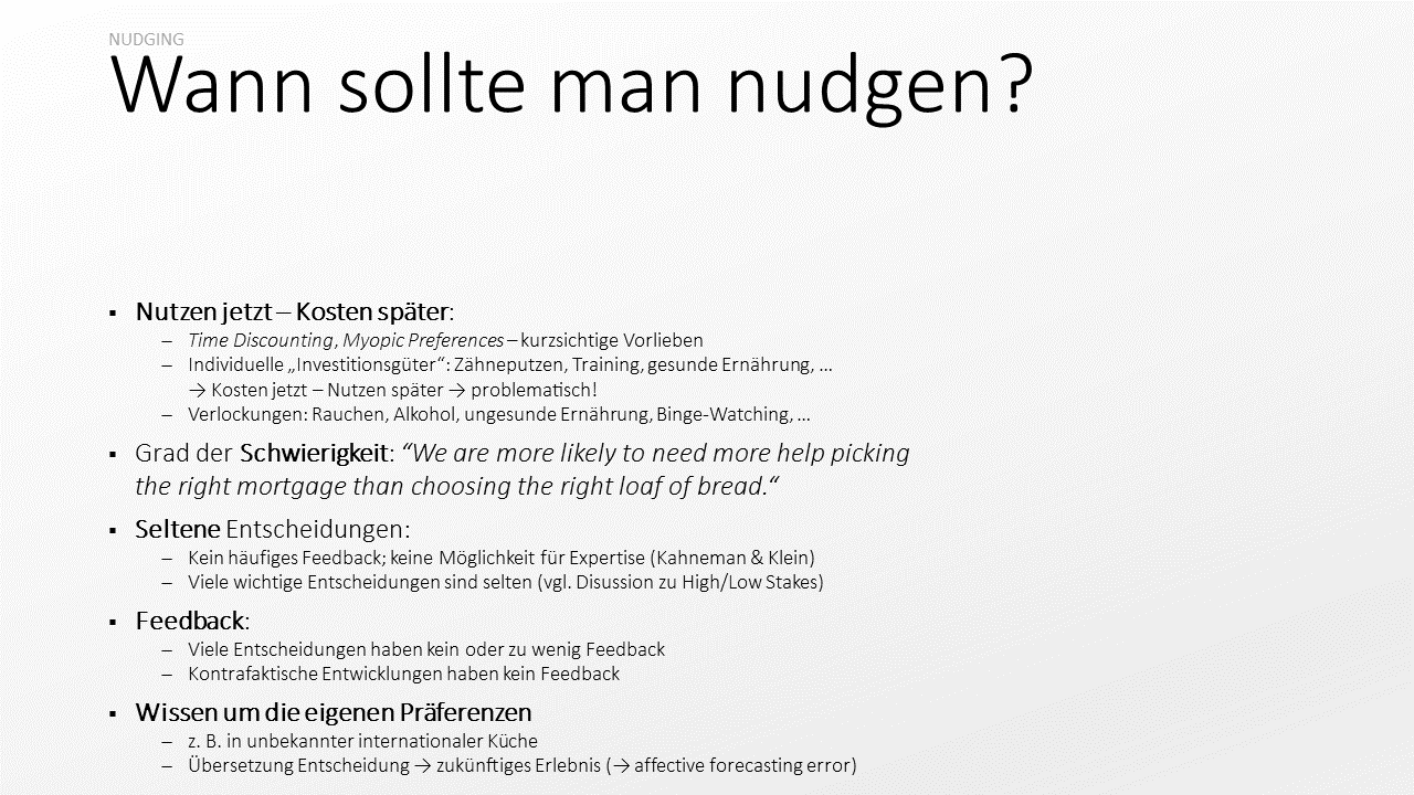 Nochmal zusammengefasst die Bedingungen, unter denen wir von Nudges profitieren können: