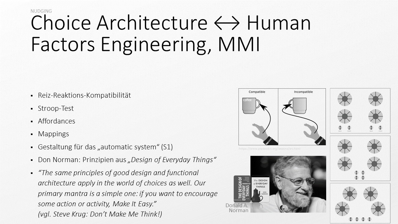 Mich freut besonders, dass sich Schritt für Schritt zwei Bereiche anzunähern scheinen, die meines Erachtens unbedingt zusammen gehören: Ergonomie (Human Factors) und Entscheidungsforschung. So hat Cass Sunstein in einer früheren Veröffentlichung bereits das “Don’t make me think” von Steve Krug prominent zitiert (Krug, 2014) – ein dünnes, aber sehr einflussreiches Buch zur Gestaltung und Evaluation von gebrauchstauglichen Internetauftritten.