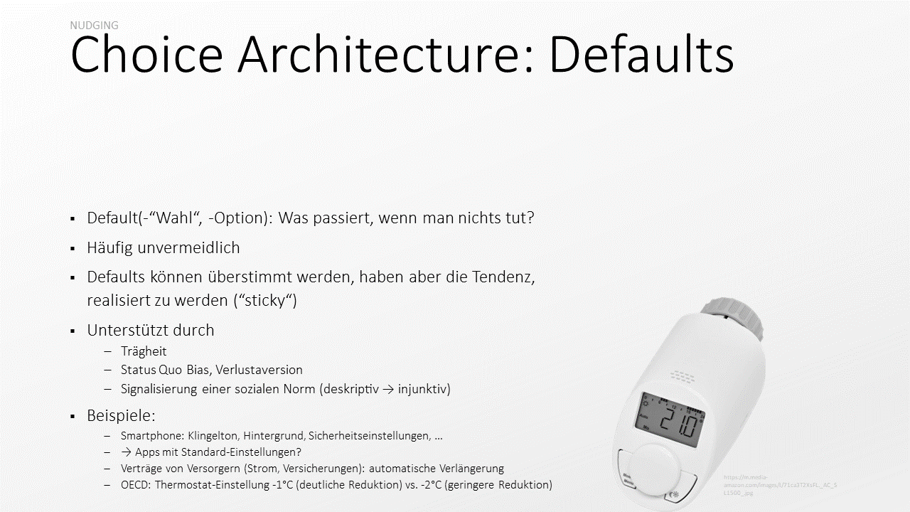 Das ist natürlich nicht immer der Fall. In einer Studie hat die OECD herausgefunden, dass Thermostate von Heizungen, deren Temperatur standardmäßig um ein Grad reduziert (bezogen auf die bisher verwendete Einstellung) ausgeliefert werden, zu einer deutlichen Einsparung von Heizkosten führen. Beträgt die standardmäßige Reduktion aber zwei Grad, steigen dadurch die Heizkosten; die Kund:innen verändern die Voreinstellung! Ein sehr interessanter und lehrreicher Befund, wie ich meine.