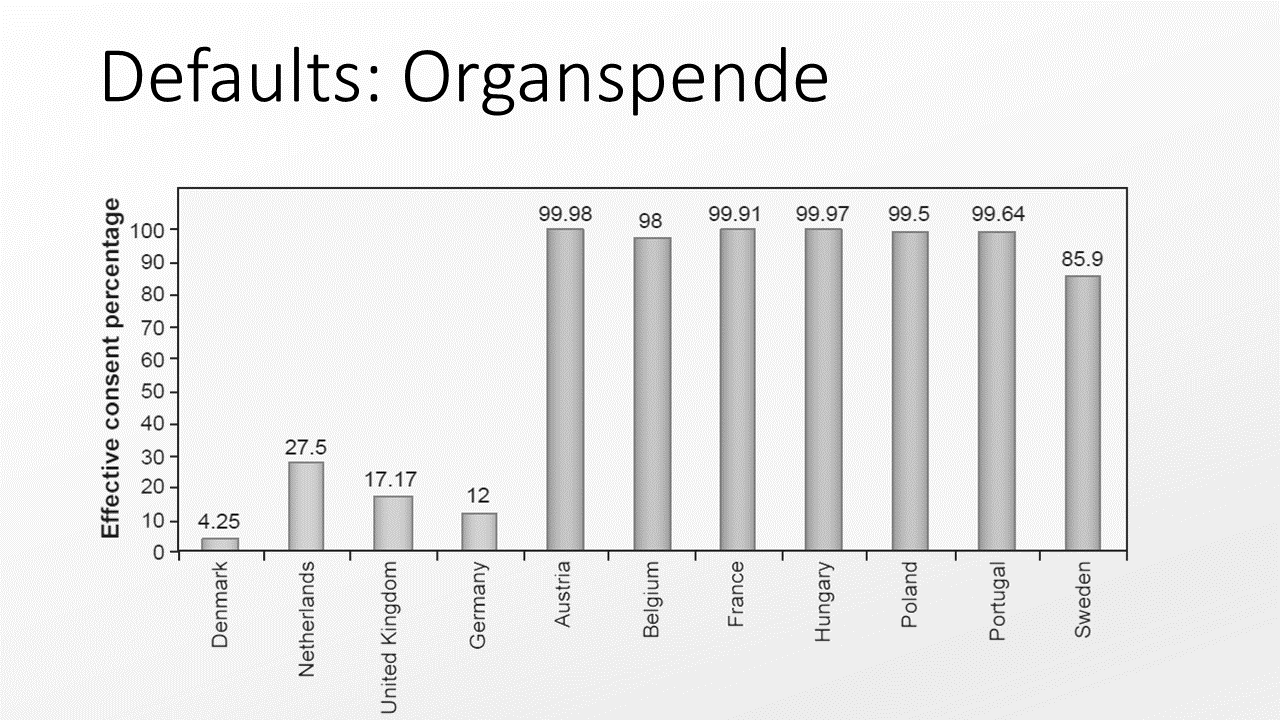 Zu Defaults müssen wir nicht viel sagen. Die kennen wir inzwischen recht gut. Für eine Auffrischung hat Eric Johnson in seinem Buch “The elements of choice” ein eigenes Kapitel dazu (Johnson, 2021). Als Mitentdecker des Phänomens ist er natürlich eine der Koryphäen auf dem Gebiet. Das berühmte Diagramm zu den Organspendequoten in Europa, das Sie auf der nächsten Folie sehen, stammt auch von ihm und Kollegen.