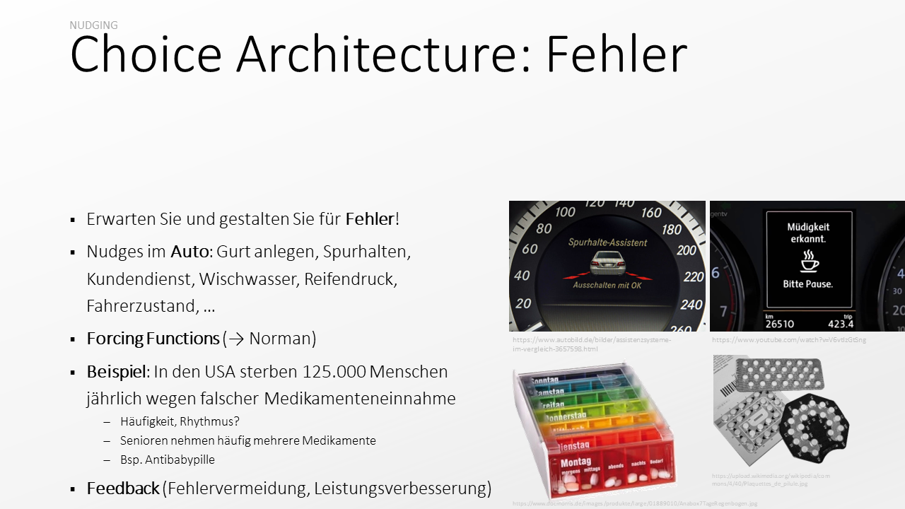 Ein konkretes Beispiel, über das Sie nachdenken können: Wie können wir die Entscheidungssituation für die Einnahme von Medikamente so gestalten, dass weniger Fehler passieren? Ein verwandtes Beispiel: Wie ist die Einnahme der Antibabypille gestaltet, so dass hier keine Fehler gemacht werden – sprich: so dass die Einnahme nicht versäumt wird? Wie können wir Informationen, Commitment Devices, Defaults, Forcing Funcktions, Constraints usw. einsetzen?