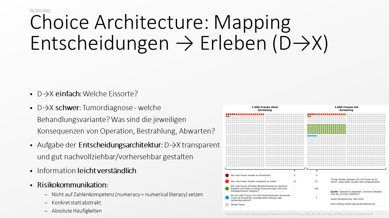 Es gibt aber auch Entscheidungssituationen, deren Folgen für unser Erleben und Verhalten weniger klar sind. Die Wahl zwischen verschiedenen Arten der Behandlung einer schweren Erkrankung zum Beispiel. Hier ist es die Aufgabe von Entscheidungsarchitekt:innen die relevanten Informationen so leicht verständlich aufzubereiten und darzustellen, dass die Folgen einer Entscheidung transparent und gut nachvollziehbar bzw. vorhersehbar sind.