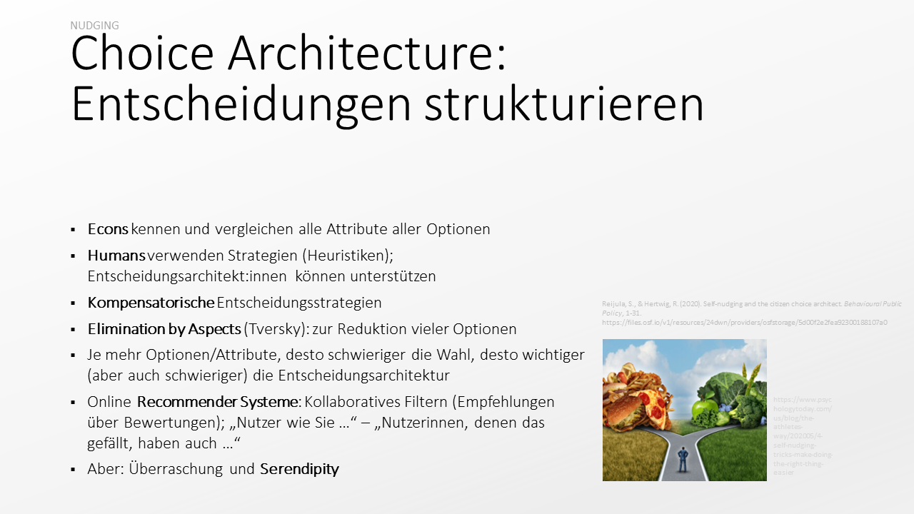 Entscheidungsarchitekturen von Online-Plattformen können auf die Aktivitäten, Entscheidungen und Daten von vielen Nutzer:innen zugreifen, um uns die Entscheidungen zu erleichtern. Durch das Verhalten von Personen, die mir in wichtigen Aspekten ähnlich sind, kann auf meine Präferenzen und mein Verhalten geschlossen werden. Dieses sog. kollaborative Filtern kann auch auf Ebene einzelner Kaufentscheidungen ergfolgen (Menschen, die Produkt X gekauft haben, haben auch Produkt Y gekauft). Dieser Daten-gestütze Mechanismus ist ein zentraler Bestandteil von Recommendersystemen von Online-Angeboten, die wir alle von Amazon, Netflix, Booking etc. kennen.