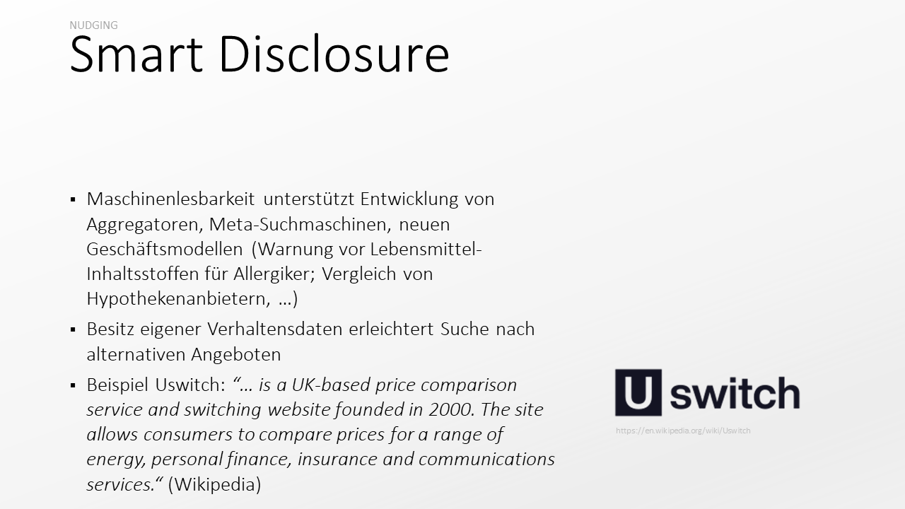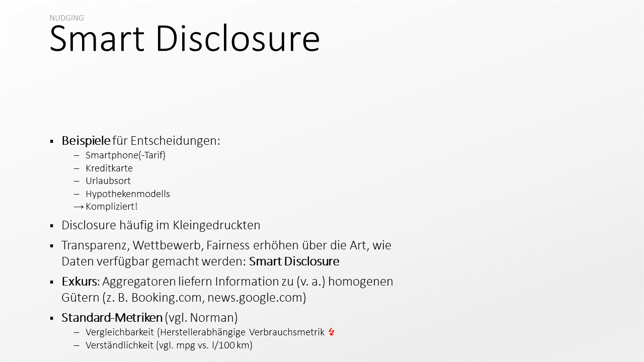 Die Adressaten von Smart Disclosure sind die Behörden und Gesetzgeber. Lesen Sie dazu gerne Kapitel 7 von Nudge. Wir klären nur den Begiff, diskutieren das Thema aber nicht in der Tiefe.