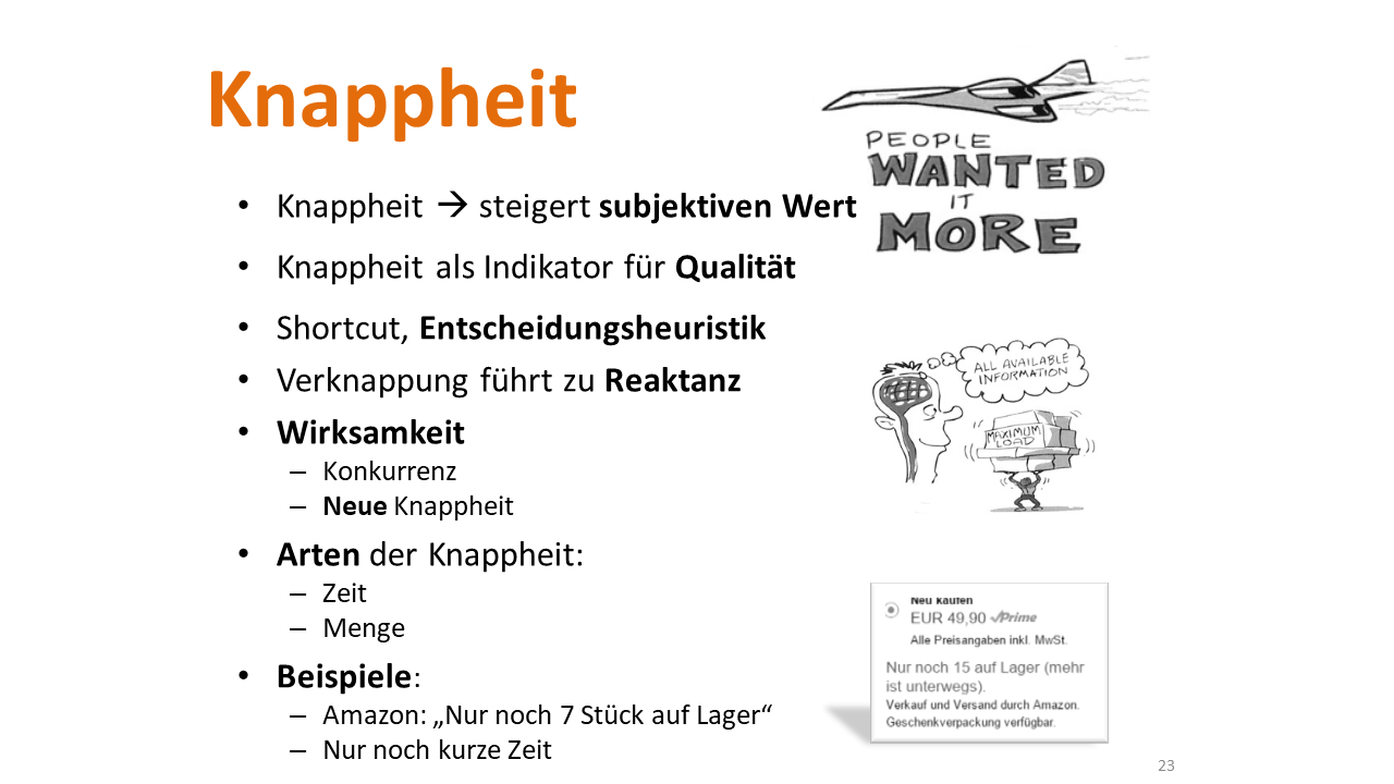 Besonders wirksam ist Knappheit bei Gütern, um die eine stark konkurrierende Nachfrage besteht, wie auch für neue Knappheit. Wie wir aus der Prospect Theory wissen, reagieren wir vor allem auf Änderungen einer Situation. Neue Knappheit ist eine bedeutsame Änderung der Situation und führt zu entsprechenden Reaktionen darauf.