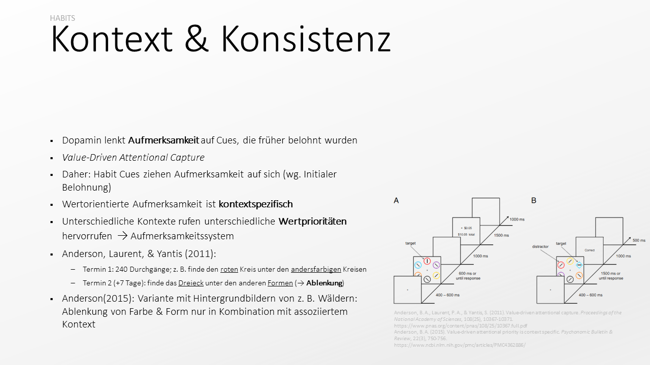 Wir erinnern uns: Das Dopaminsystem zeichnet bei der Habitbildung vor allem für den Belohnungsaspekt verantwortlich. Es hat aber noch einen weiteren wichtigen Zweck: Auf der Grundlage früherer Belohnungserfahrungen lenkt Dopamin unsere Aufmerksamkeit auf Cues unserer Umgebung. Wir werden also eher auf die Elemente unseres Kontexts aufmerksam, die früher einmal belohnt wurden. Der Fachbegriff, der diesen Mechanismus zusammenfasst, lautet Value-Driven Attentional Capture.