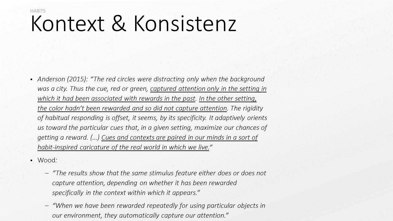 Mit Kontext, Wiederholung und Belohnung haben wir nun die wichtigsten Attribute von Gewohnheiten eingeführt. Lassen Sie uns etwas tiefer gehen und für die einzelnen Dimensionen ein paar Akzente setzen. In der Unter-Überschrift der Folien sollen die beiden Pluszeichen diese Akzentuierung veranschaulichen.