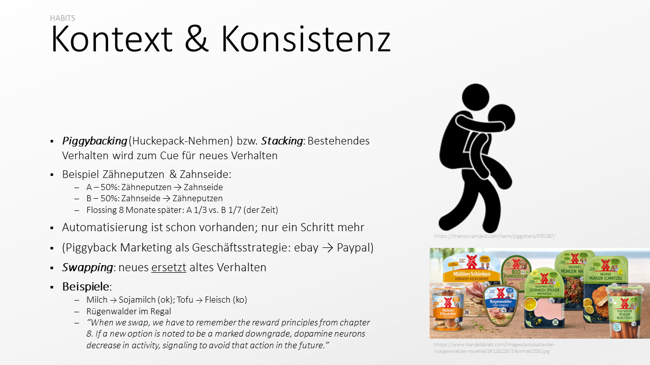 Was war das Ergebnis? Die Gruppe „erst putzen, dann flossen” hat die neue Gewohnheit erfolgreicher entwickelt. Nach acht Monaten war sie bei ca. 1/3 noch vorhanden. In der Gruppe „erst flossen, dann putzen” waren es nicht mal halb so viele Personen, die das Verhalten als Habit entwickelt haben. Warum? Die Antwort ist natürlich: Piggybacking. Für die erste Gruppe konnte das neue Verhalten an bestehenden Gewohnheiten andocken – auf ihnen aufbauen. Eine gewohnheitsmäßige Automatisierung ist schon vorhanden; es wird nun nur ein Schritt mehr angehängt. In der anderen Gruppe musste die Gewohnheit völlig ohne Basis entwickelt werden. Piggybacking existiert auch als Marketing-Strategie. Das ist nicht wirklich unser Thema; ich möchte Sie aber darauf hinweisen. Bei Interesse finden Sie im dem Buch von Wendy Wood weitere Informationen und Verweise.