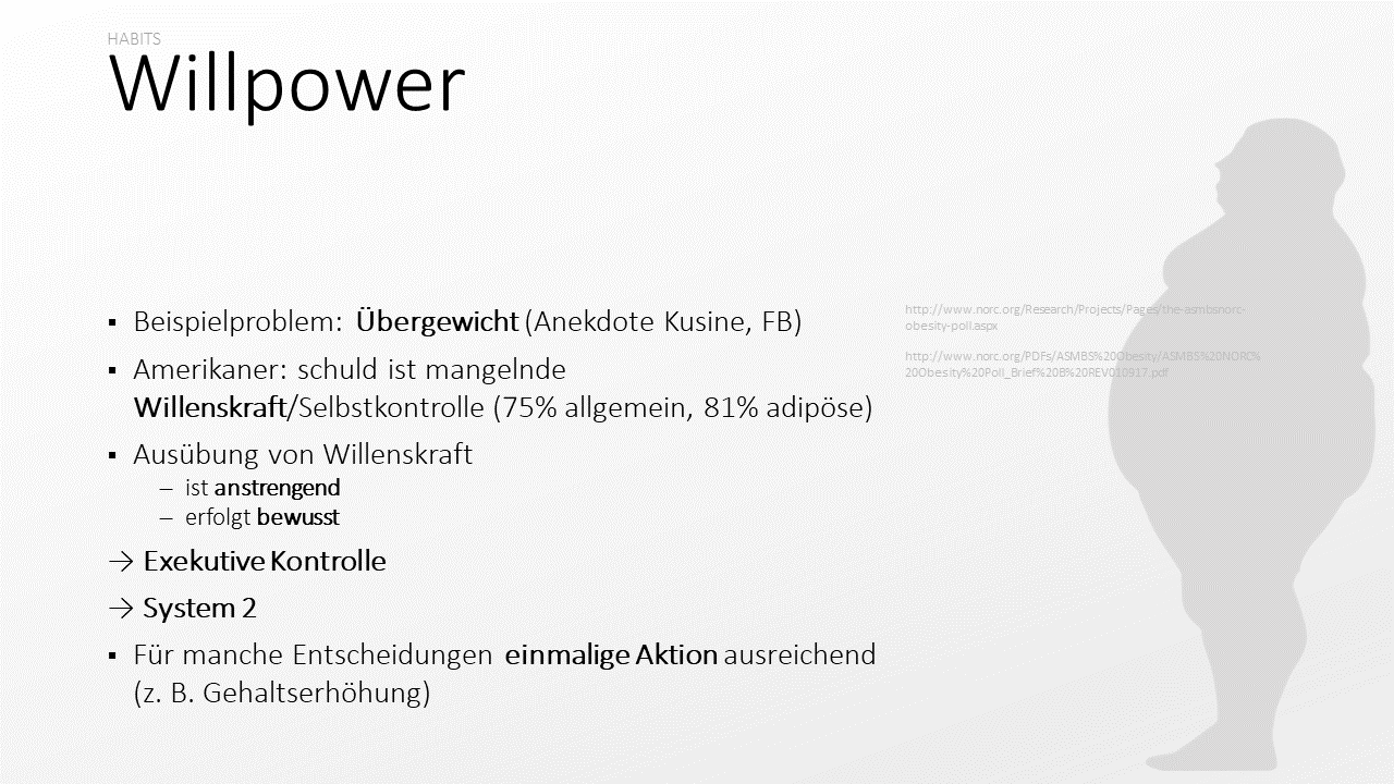 Wenn man die amerikanische Bevölkerung nach den größten Hürden für Gewichtsverlust bei Adipositas frägt, sehen drei Viertel die Ursache in einem Mangel an Willenskraft. Vielleicht überraschend: Bei Adipösen ist diese Überzeugung noch ausgeprägter; hier sind es 81 Prozent (NORC, 2016).