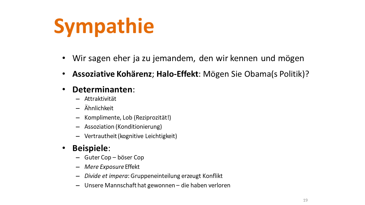 Wir sagen eher ja zu Leuten, die uns sympathisch sind. Das ist nicht wirklich überraschend. Das wissen Sie schon lange. Neu ist vielleicht das Ausmaß, in dem Sympathie wirkt. Wenn uns eine Person sympathisch ist, nehmen wir viele weitere persönliche Attribute so wahr, dass sie gut zu diesem sympathischen Grundeindruck passen. Wir schreiben uns sympathischen Personen alle möglichen weiteren Eigenschaften zu: Zuverlässigkeit, Loyalität, Freigebigkeit usw. Das machen wir auch dann, wenn wir zu diesen anderen Eigenschaften keinerlei Informationen haben. Aus einer anderen Vorlesung kennen Sie vielleicht den zugrundeliegenden psychologischen Mechanismus unter der Bezeichnung Halo-Effekt.