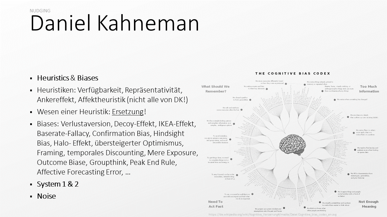 Die Forschung zu Heuristics & Biases hat die Entscheidungspsychologie geprägt und tut dies immer noch. Es gibt inzwischen eine völlig unübersichtliche Fülle von kognitiven Verzerrungen und Entscheidungsheuristiken. Einen Eindruck bekommen Sie, wenn Sie auf Wikipedia nach dem Cognitive Bias Codex suchen.